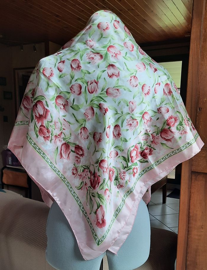 Foulard rose imprimé fleuri Dimension : 95 x 95 cm Marque : Moniteur 100 % polyester