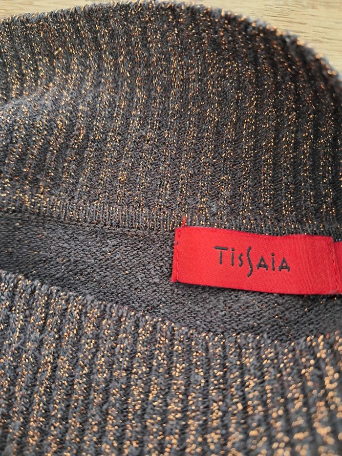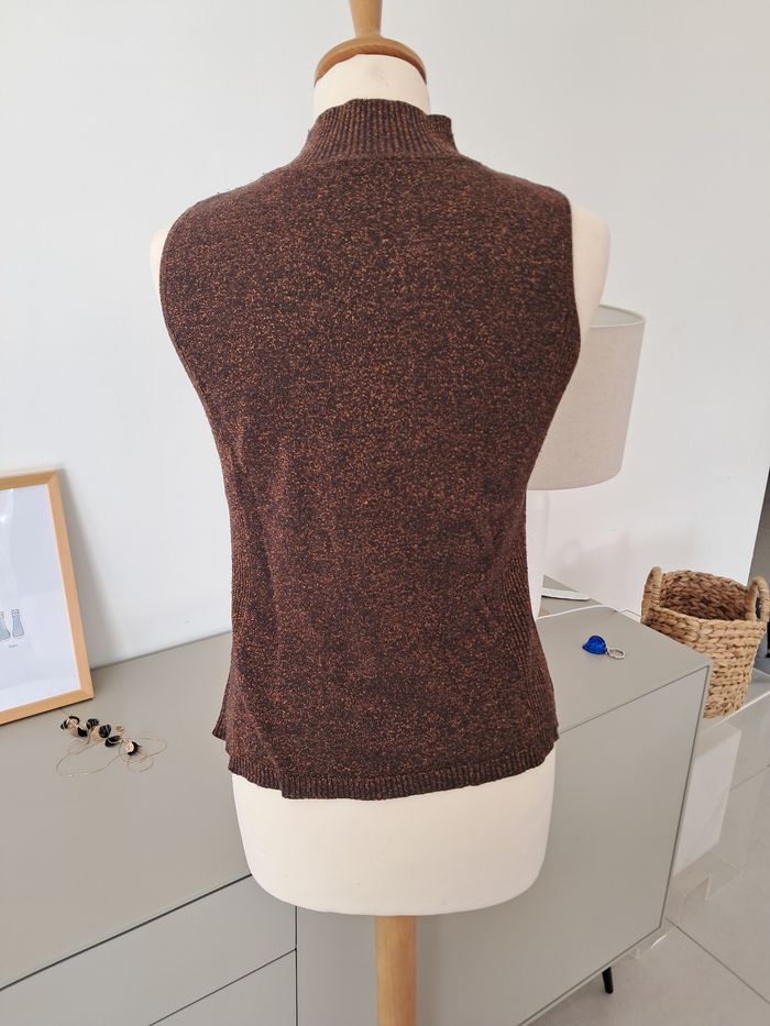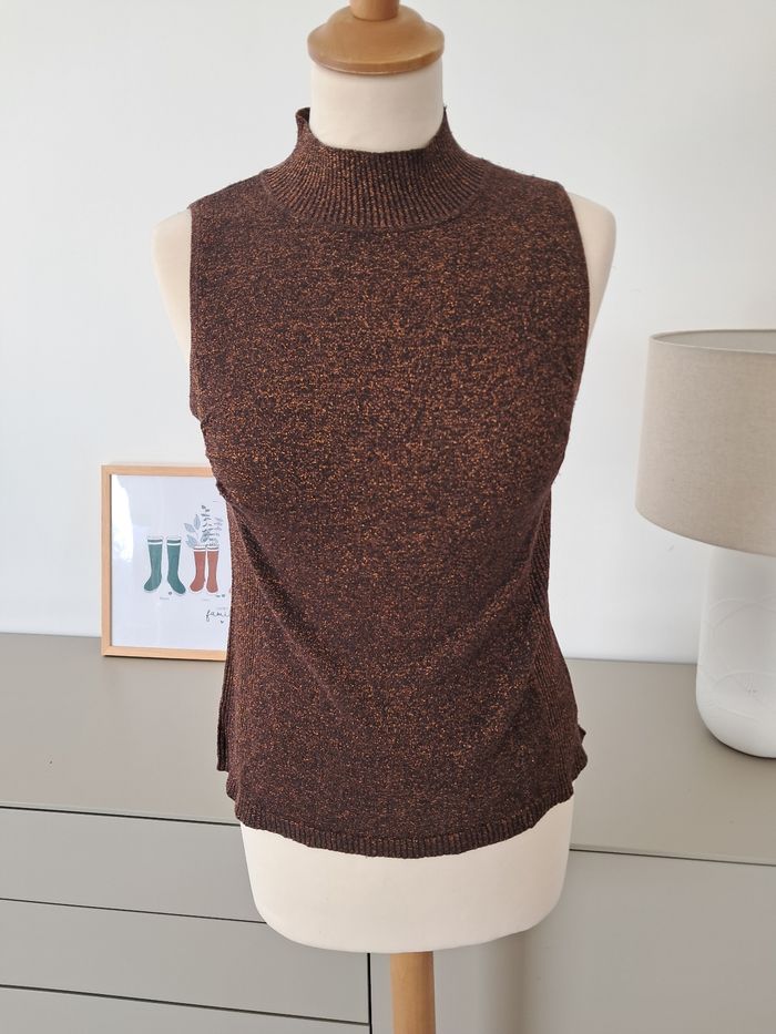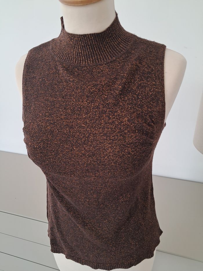Haut sans manche col montant à paillettes marron doré, idéal pour sortir. Noté 42/44 mais c'est un 36 ! Excellent état, marque Tissaia