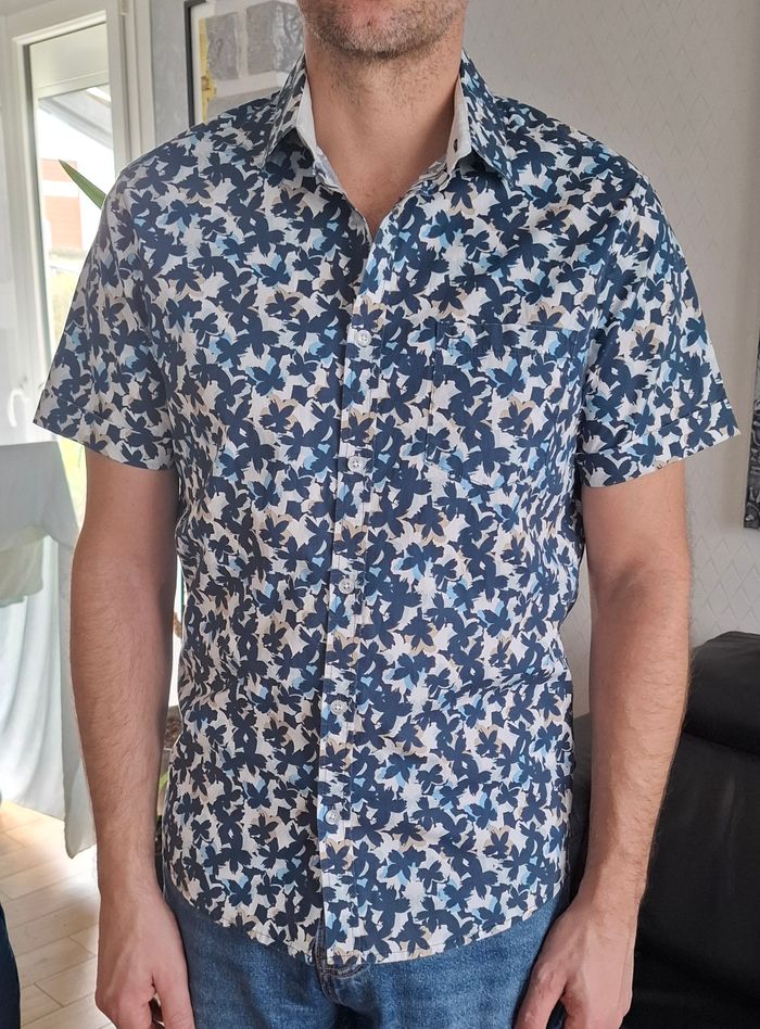 chemise BONOBO à motifs feuillages bleus, taille M, coupe regular, 1 poche poitrine, très bon état