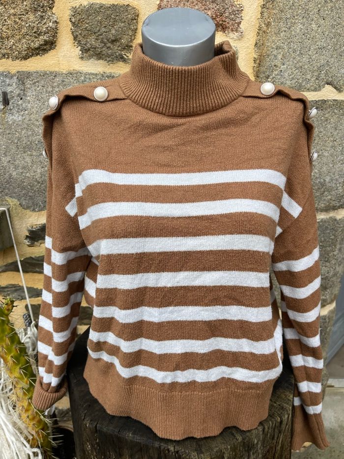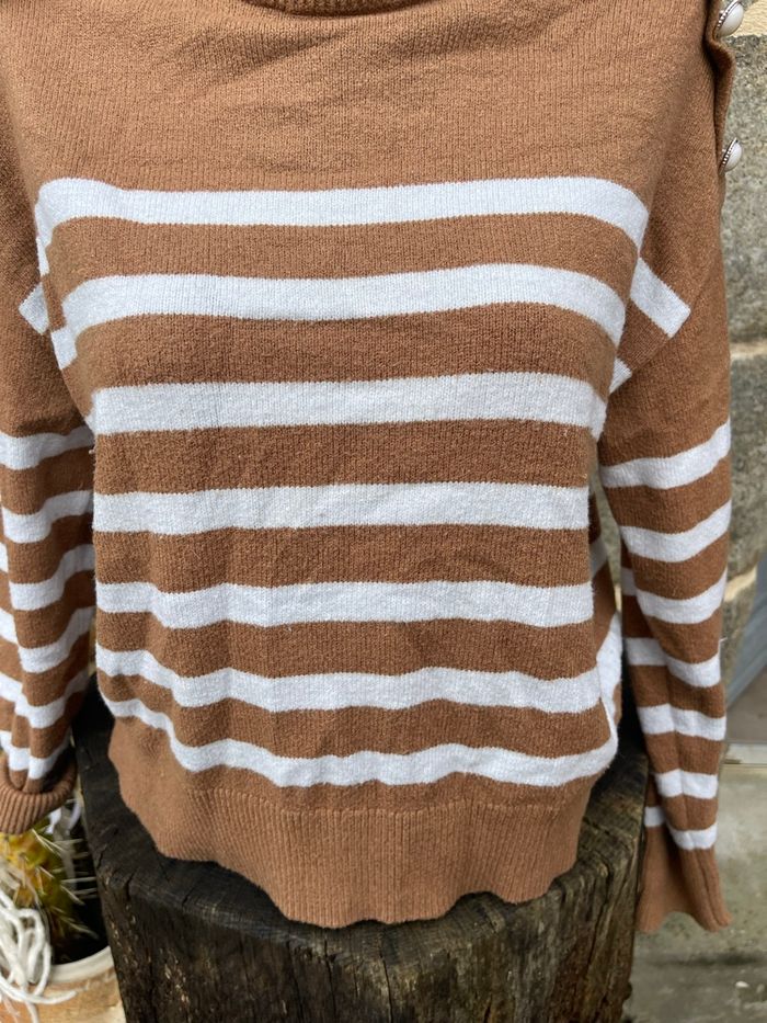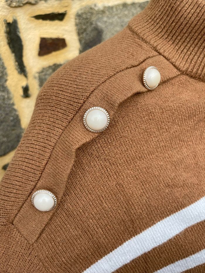 Pull en maille marron avec rayure blanche Épaulette et bouton dorée sur les épaules Taille L Kiabi Très bonne état