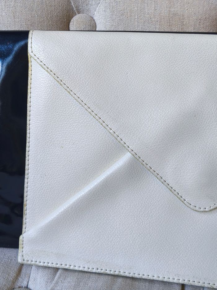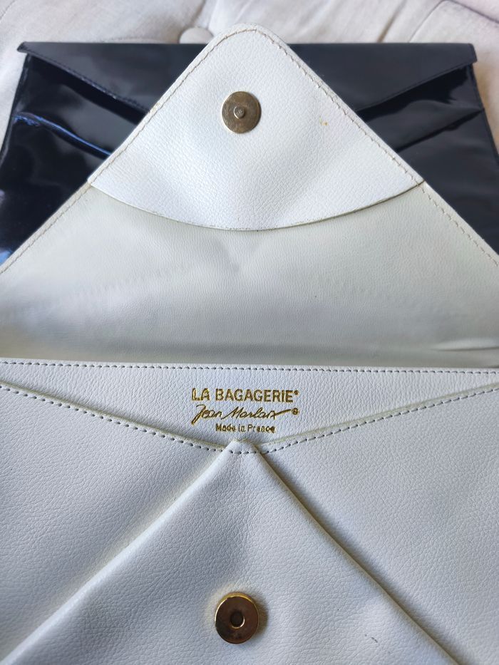 LA BAGAGERIE – Jean Marais, Made in France 🇫🇷. Lot de 2 pochettes / Clutch vintage en cuir véritable de qualité, format enveloppe, fermeture pression. Intérieur doublé avec compartiment principal. Logo embossé “La Bagagerie – Jean Marais – Made in France” à l’intérieur. 🕊️ Blanc / ivoire : cuir lisse, aspect mat, chic et intemporel 🖤 Noir : cuir verni brillant, plus audacieux et sophistiqué Dimensions : 26cm x 17cm Bon état général (légères traces d’usage normales pour du vintage). 👉 Possibilité de vente à l’unité > 40€uros. • Marque : La Bagagerie (maroquinerie française) • Matière : cuir / cuir verni • Format : pochette / clutch • Fermeture : bouton pression • Fabrication française 🇫🇷.