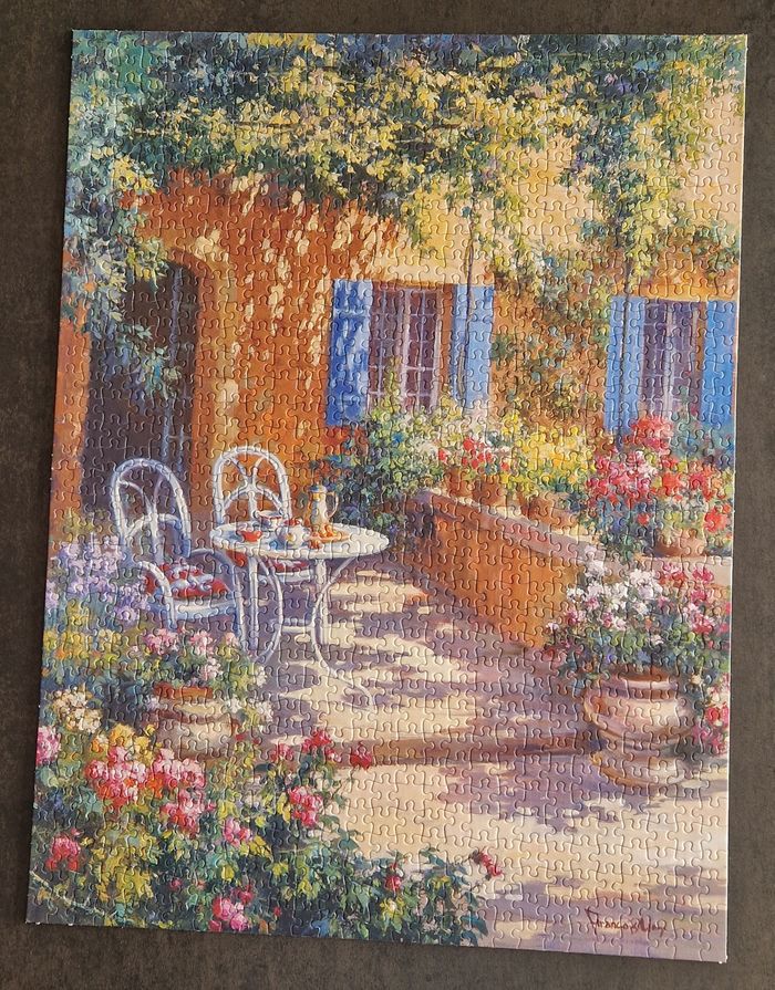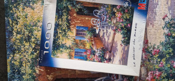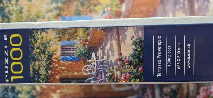 Puzzle MB / Hasbro de 1000 pièces intitulé "Terrasse provençale" représentant une terrasse fleurie et à demi ensoleillée - Pièces épaisses et brillantes de qualité - Dimensions : voir photos - Niveau de difficulté : moyen mais NB : particularité qui ajoute à la difficulté du puzzle si vous prenez la boîte en modèle, l'image est inversée ! Complet, évidemment - TB, voire excellent état du puzzle mais boîte endommagée (voir photos) - Autres puzzles de 1000 ou 1500 pièces également en ligne et réductions possibles sur les lots de puzzles ou autres articles. #isa91jeuxetjouets #isa91puzzles