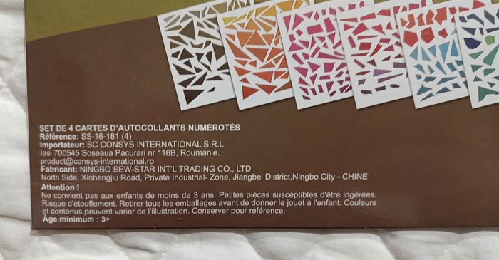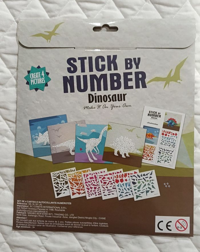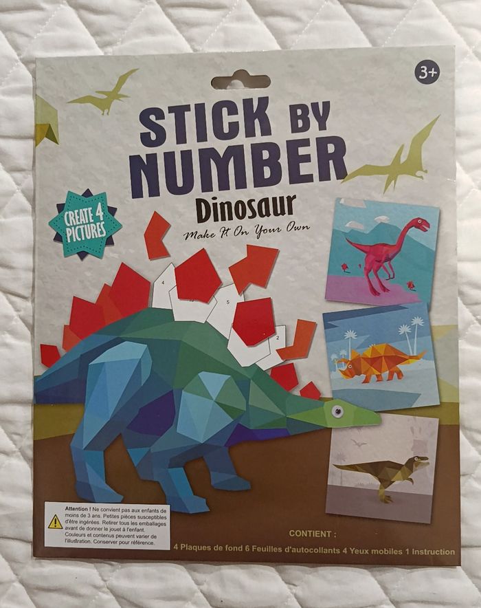Mosaïque par numéro dinosaure. Set de 4 cartes d'autocollants. Ensemble d'autocollant à coller en suivant les numéros. Idéal pour occuper le temps des enfants et faire travailler leur concentration et leur patience. Neuf sous emballage