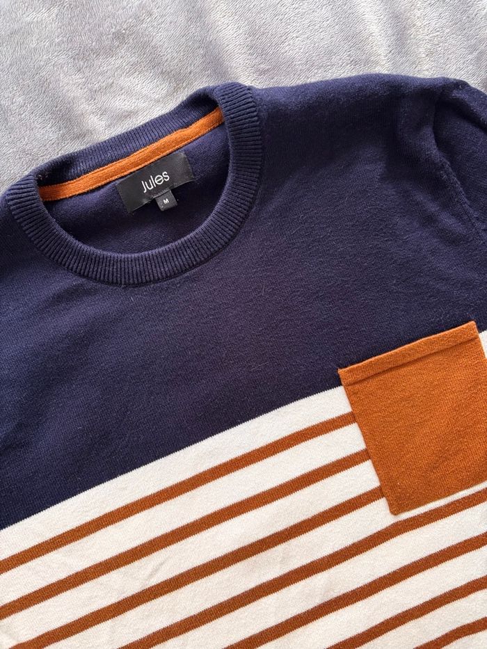 Vends, pull Jules pour homme, taille M, style marinière blanc avec rayures camel. • Détails : Petite poche brodée sur le côté gauche, touche élégante et originale. • État : Très bon état, peu porté, aucune tache ni défaut. • Matière : Confortable et légère, idéal pour la mi-saison. • Style : Marinière classique et chic, facile à assortir avec un jean ou un pantalon casual pour un look élégant mais décontracté. Envoi rapide et soigné N’hésitez pas à regarder le dressing ☺️ ‼️Photos et videos seront faites avant chaque envoi.‼️