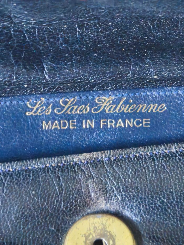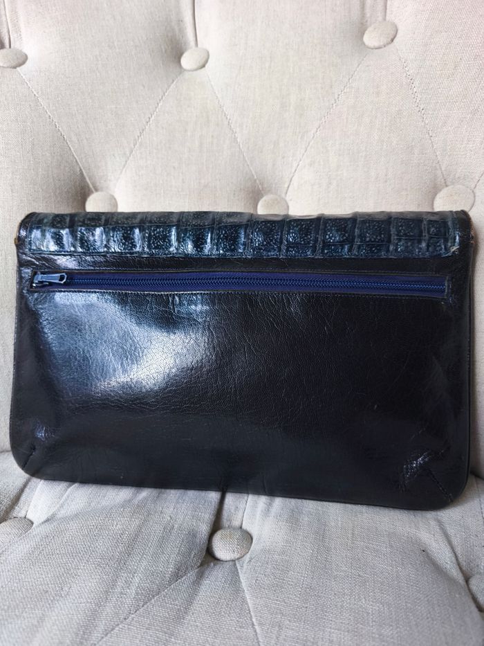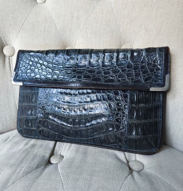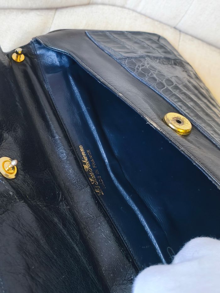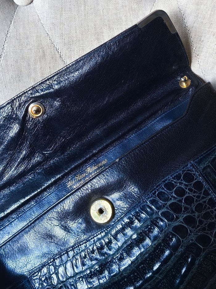 LES SACS FABIENNE - Made in France 🇫🇷. Pochette vintage en cuir véritable embossé façon crocodile sur une face, et en cuir lisse, sur l'autre, avec une poche zippée pratique. Format enveloppe élégant avec rabat structuré et finitions métal argenté aux angles. Le cuir intérieur est pleine fleur lisse (très qualitatif). Couleur bleu marine / bleu nuit, chic et intemporelle. Fabrication française 🇫🇷. Dimensions : 27cm x 17cm Cuir épais et souple, belle tenue, finitions soignées. Belle patine du cuir. Très belle pièce vintage authentique : de légères traces liées à l’âge peuvent être présentes. • Marque : Les Sacs Fabienne • Matière : cuir véritable embossé façon croco • Fermeture par pression • Poche extérieure zippée • Fabrication française 🇫🇷.