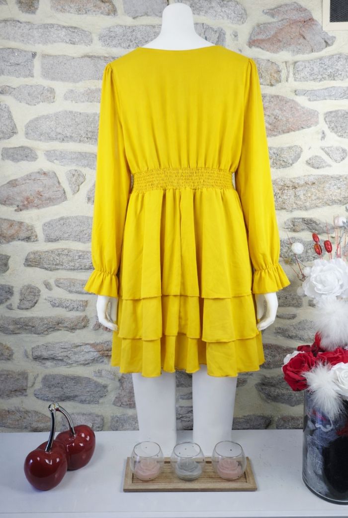 Robe patineuse manches longues bouffantes jaune citron pepsy Femme taille 54 marque Asos ✴️ Manches longues bouffantes ✴️ Col V cache-cœur ✴️ Poignets élastiqués volantés ✴️ Taille élastiquée smockée ✴️ Jupon à trois étages volantés ✴️ Couleur > Jaune safran pepsy ✴️ Composition => 95 % polyester 5 % elastanne ✴️ Mesure épaules à épaules => 41,5 centimètres ✴️ Longueur => 121 centimètres ✴️ Tour de poitrine => 121 centimètres ✴️ Tour de taille => 110 centimètres
