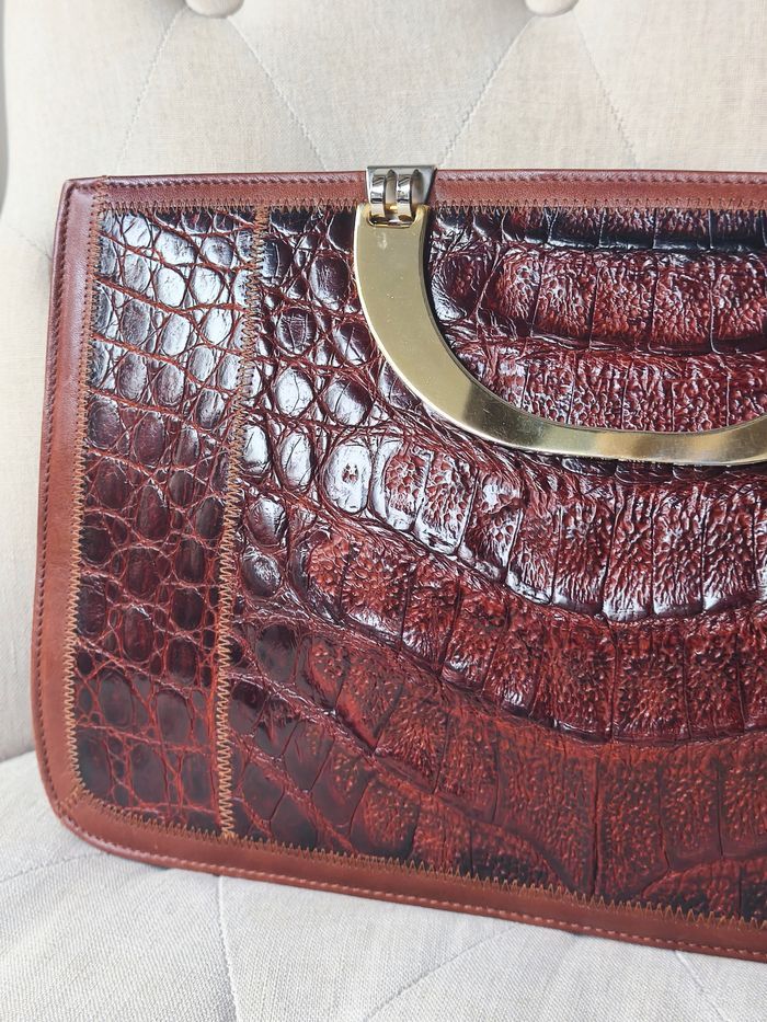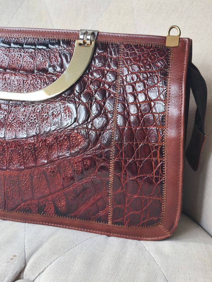 🤎Sac vintage en cuir véritable embossé façon croco – anse rigide métal doré - photo numéro 1