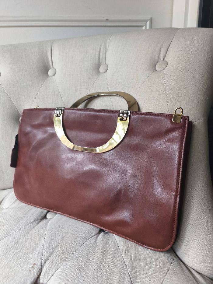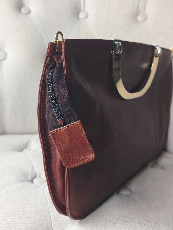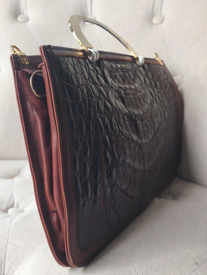 Sac à main vintage en cuir véritable embossé façon crocodile sur une face, et en cuir lisse, aspect mat sur l'autre. Coloris marron / chocolat avec superbe anse rigide en métal doré. Pièce élégante et intemporelle 🤎 👉 Se porte à la main. 👉 Les attaches pour bandoulière sont présentes, mais la chaîne / bandoulière n’est pas fournie. Très belle pièce vintage authentique (marque inconnue). Très bon état général. Le cuir est bien conservé, belle tenue (de légères traces liées à l’âge peuvent être présentes). • Matière : cuir embossé croco • Couleur : marron foncé • Poignée rigide métal doré • Style : vintage / rétro chic • Intérieur spacieux