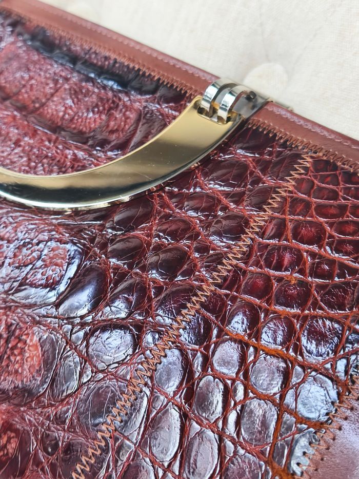 🤎Sac vintage en cuir véritable embossé façon croco – anse rigide métal doré - photo numéro 8