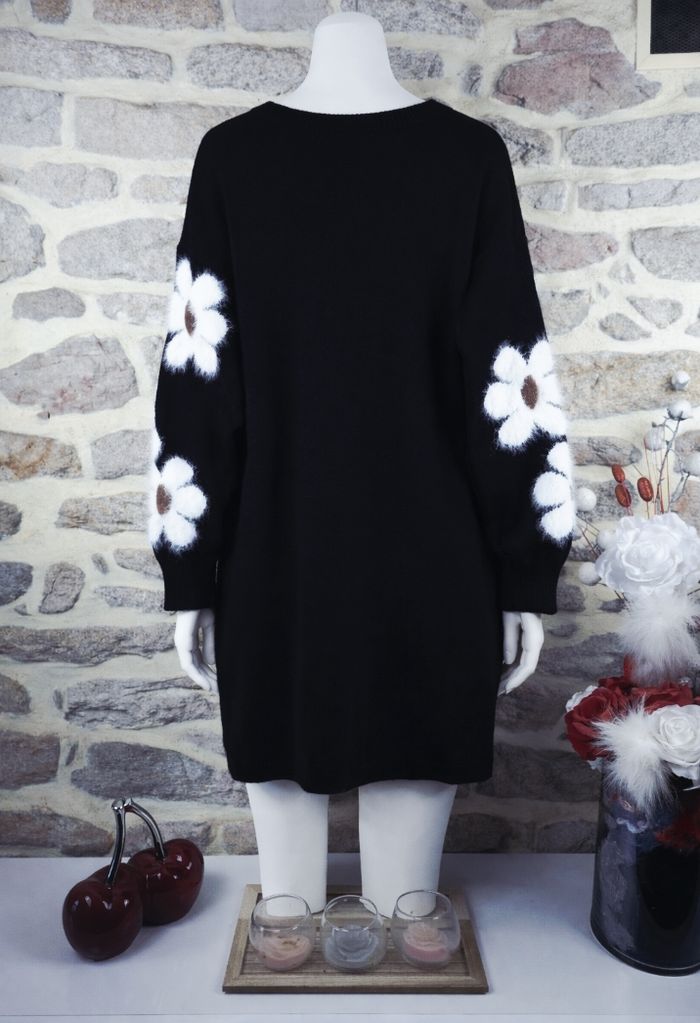 Robe pull en tricot noire au motif marguerites sur les manches Femme taille 54 marque Asos ✴️ Manches longues ✴️ Col rond ✴️ Bords cotes à I encolure, aux poignets et à l'ourlet ✴️ Couleur => Noir orné de grandes fleurs blanches duveteuses au centre terre de Sienne ✴️ Composition => 100 % acrylique ✴️ Longueur => 98 centimètres ✴️ Mesure épaules à épaules => 67 centimètres ✴️ Tour de poitrine => 132 centimètres