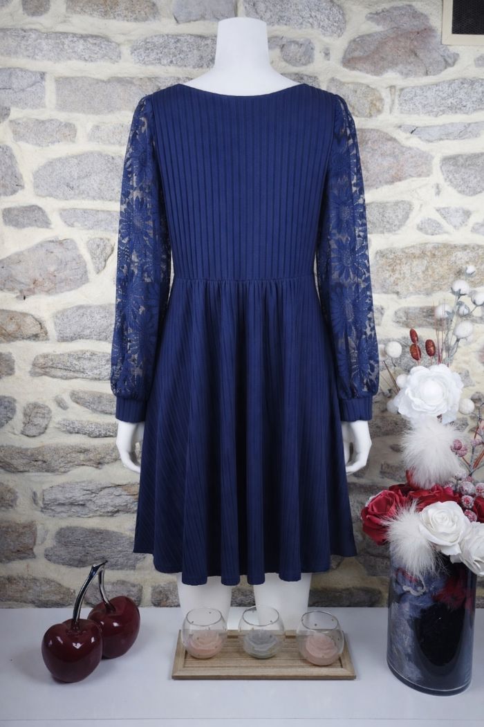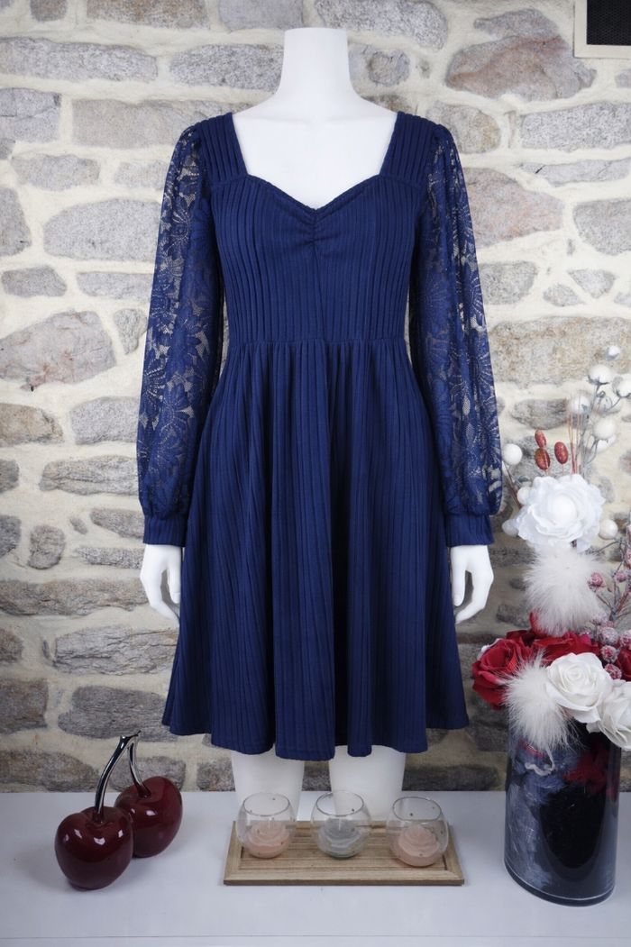 Robe patineuse en tricot manches longues dentelle midnight blue Femme taille 52 marque Asos ✴️ Manches longues bouffantes en dentelle florale ✴️ Taille marquée ✴️ Décolleté en V ✴️ Poignets élastiqués ✴️ Couleur => Midnight blue ✴️ Composition => 33 % viscose 66 % acrylique 1 % elastanne ✴️ Longueur => 99,5 centimètres ✴️ Mesure épaules à épaules => 42 centimètres ✴️ Tour de poitrine => 118 centimètres ✴️ Tour de taille > 104 à 130 centimètres