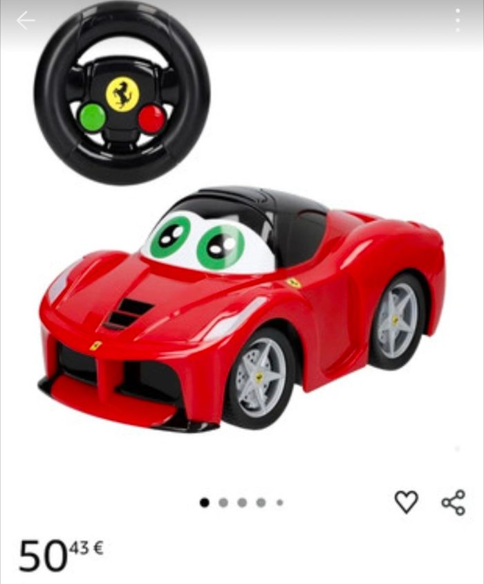Voiture Ferrari télécommandée Chicco - Premier âge Description : Article : Véritable voiture de course Ferrari rouge avec sa télécommande en forme de volant, idéale pour les jeunes enfants. Fonctionnement : La télécommande est intuitive avec des boutons simples (marche avant, virage) pour une prise en main facile dès 2 ans. La voiture émet des bruits de moteur et un klaxon réalistes. État : Très bon état général. Quelques légères traces d'utilisation normale sur le plastique, mais fonctionne parfaitement. Marque : Chicco (sous licence officielle Ferrari). Infos complémentaires : 🚭 Maison non-fumeur. 📦 Envoi rapide et colis protégé. ✨ N'hésitez pas à regarder mes autres annonces pour grouper vos achats !