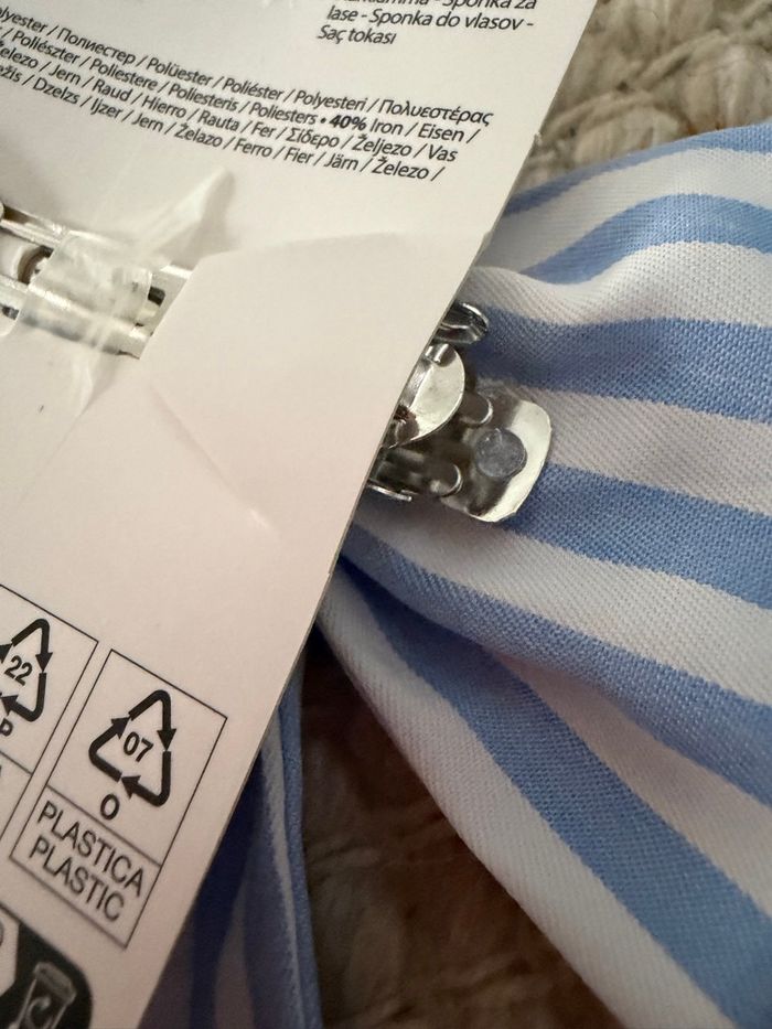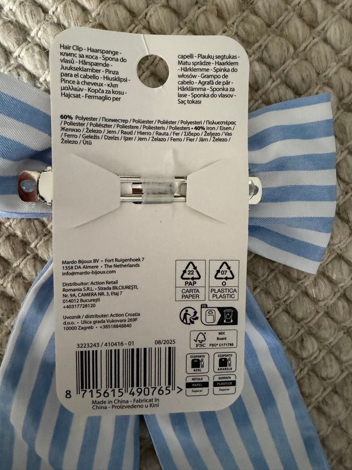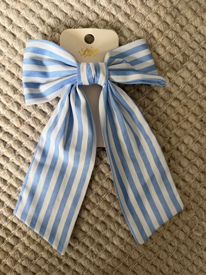 Barrette à cheveux pour enfant. Noeud en tissu bleu à rayures blanc. Neuf.