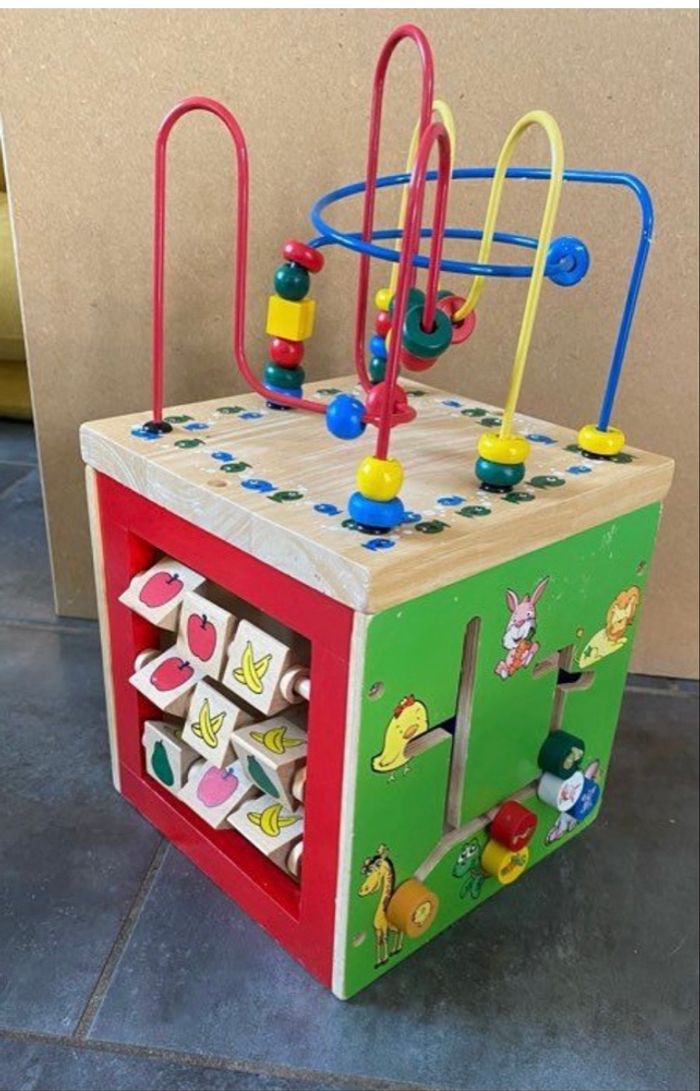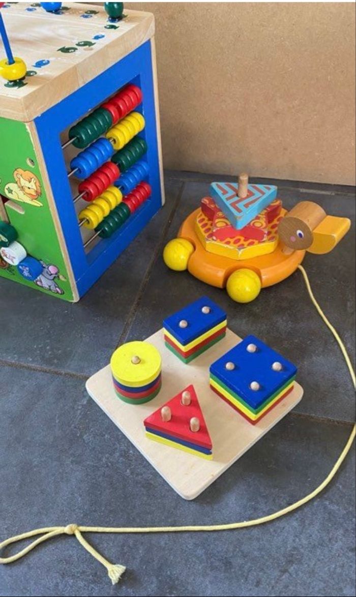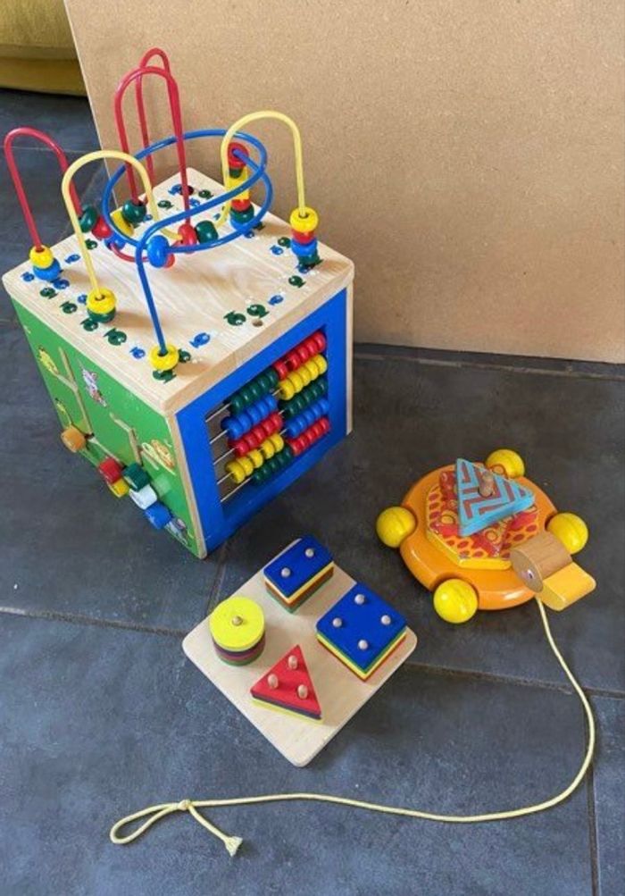 Voici un ensemble de jouets en bois éducatifs que je souhaite vendre. Cet ensemble comprend un cube avec différents éléments de motricité fine comme des perles à enfiler, des formes géométriques à emboîter et un petit labyrinthe. Il y a aussi un petit chariot en bois avec des formes à trier par couleur. Ces jouets sont parfaits pour stimuler le développement des compétences motrices et cognitives des jeunes enfants. Ils sont en très bon état et prêts à être utilisés pour de nouvelles aventures ludiques et éducatives ! - Ensemble de jouets en bois éducatifs - Comprend un cube avec activités de motricité fine - Chariot en bois avec formes à trier par couleur - Jouets en excellent état, parfaits pour les jeunes enfants - Favorise le développement des compétences motrices et cognitives