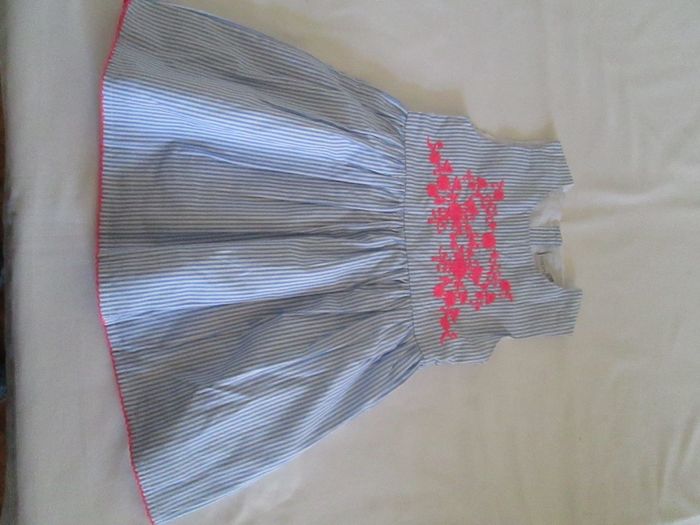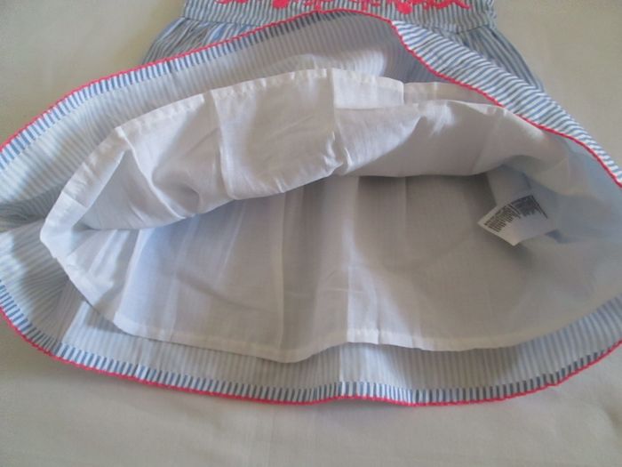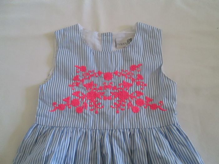 Vends robe Happy Girl rayée bleu ciel et blanc. Broderie sur le devant. Feston en bas de la robe. Boutonnage jusqu'à la moitié dans le dos. Doublée sur toute la longueur. 100 % coton. Taille 3 ans. Neuve, jamais portée. N'hésitez pas à consulter mes autres annonces.
