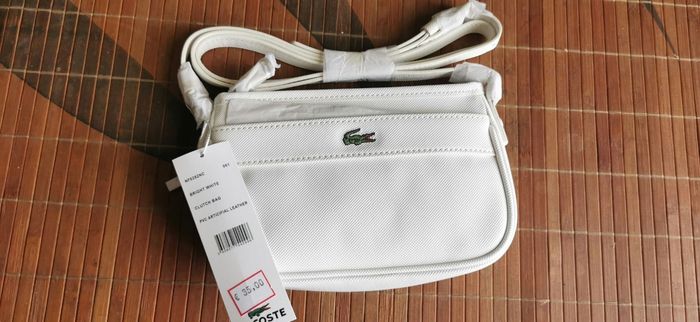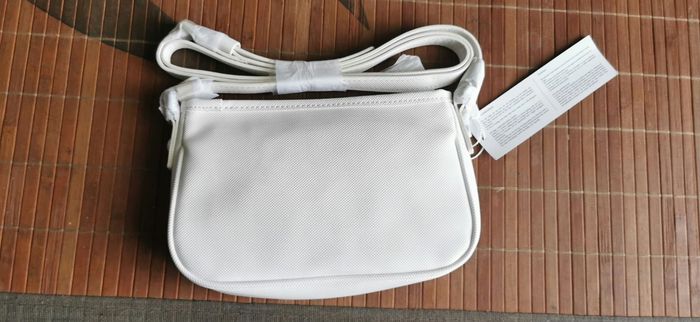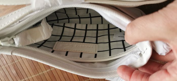Sac Lacoste blanc. 1 poche zippée à l'intérieur. PVC Largeur : 22 cm, hauteur : 13 cm