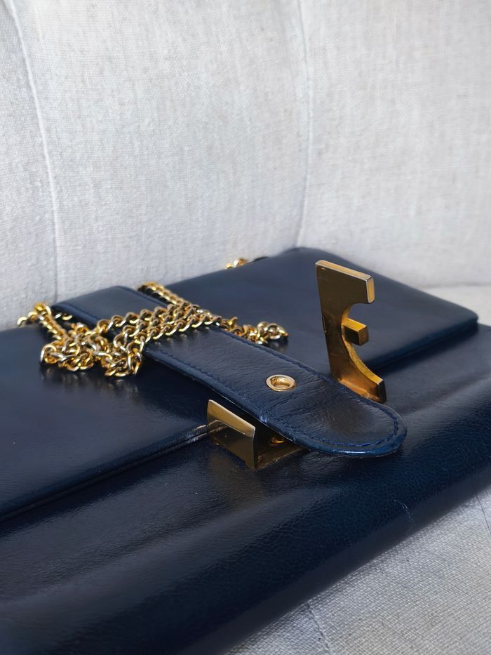 💙 Sac vintage chic en cuir bleu - chaîne maille dorée et fermoir graphique