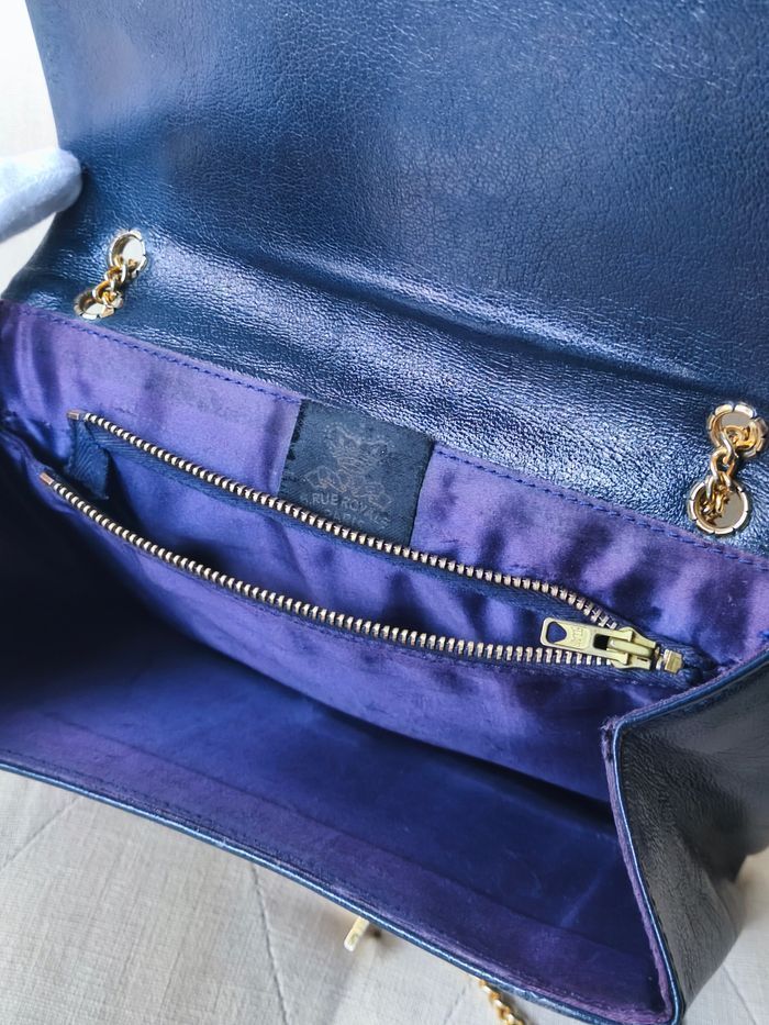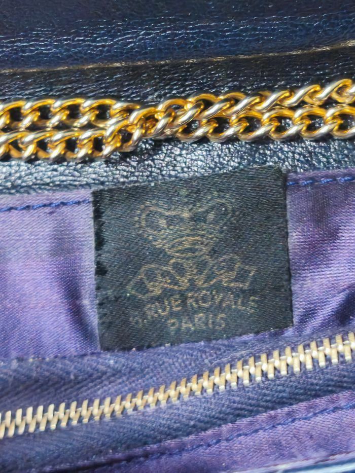 Sac vintage élégant en cuir véritable, pleine fleur lisse, coloris bleu marine, avec chaîne dorée pour un porté épaule ou croisé. Très joli fermoir doré, très graphique, très couture, typique du style vintage chic. Intérieur doublé tissu avec poche zippée, finitions élégantes et soignées. Présence d'une étiquette cousue, avec un logo et mention "6 RUE ROYALE PARIS" (voir photo). Dimensions : 20cm x 16cm Cette pièce Vintage, milieu/haut de gamme de l'époque, est structuré, avec une belle tenue et une patine naturelle du cuir. Très bon état vintage. Légères traces d’usage normales liées à l’âge, sans défaut majeur (voir photos). • Matière : cuir véritable • Couleur : bleu marine • Chaîne métal doré • Fermoir métal doré • Style vintage chic