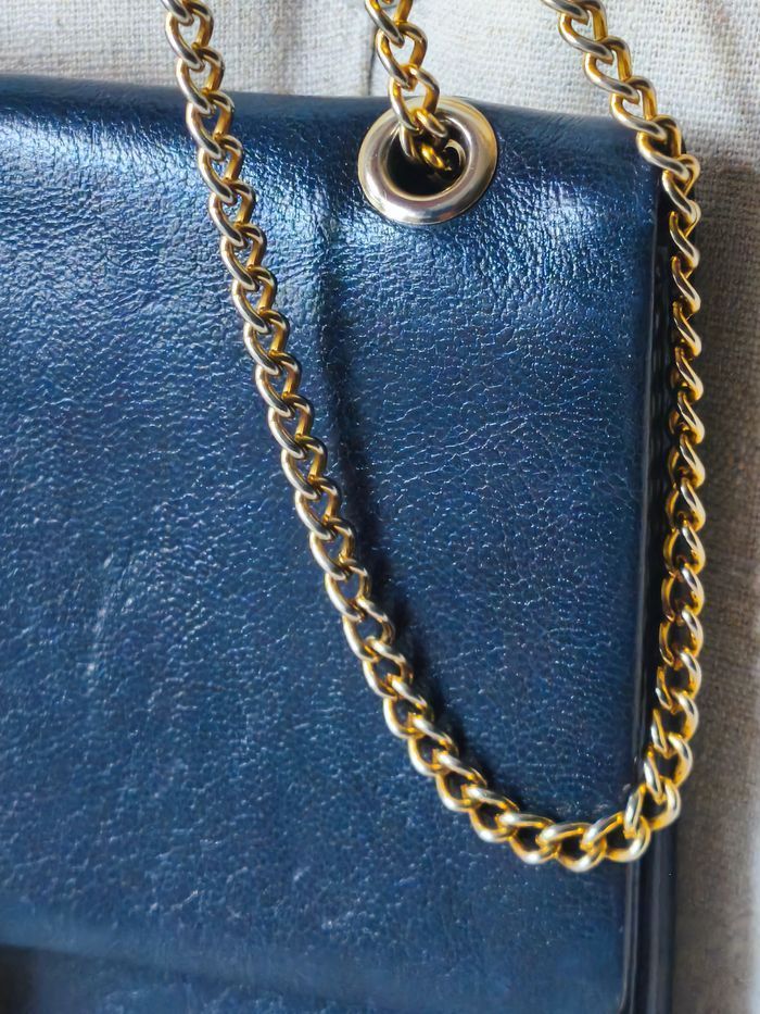 💙 Sac vintage chic en cuir bleu - chaîne maille dorée et fermoir graphique - photo numéro 8