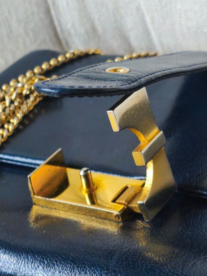 💙 Sac vintage haut de gamme en cuir bleu - chaîne maille dorée et fermoir graphique - photo numéro 7