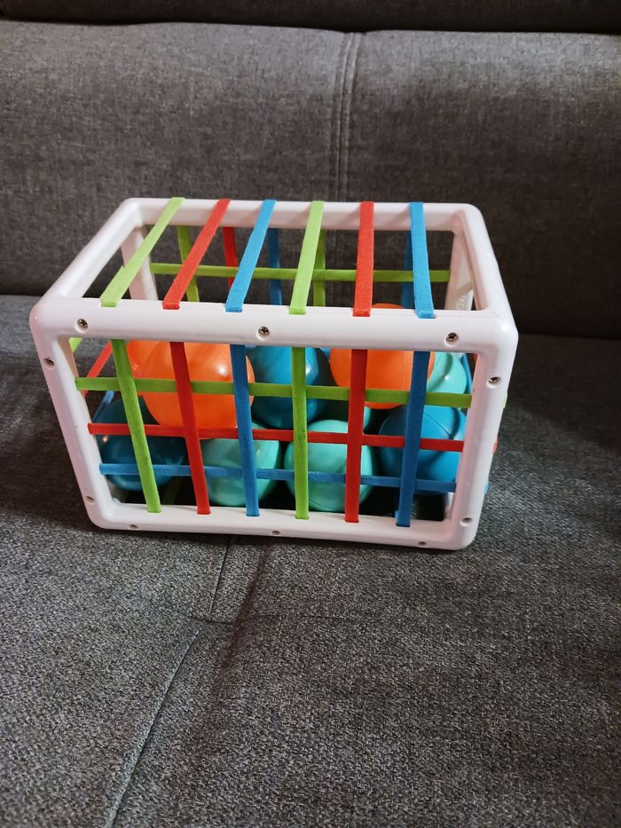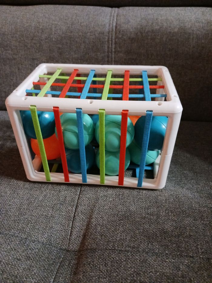 Ludi cube de manipulation . Jouets d'éveil bébé, dès 10 mois. Développe la réflexion, la motricité fine, le toucher & la découverte - 1 Cube Élastique + 11 balles oranges & bleues au son rigolo