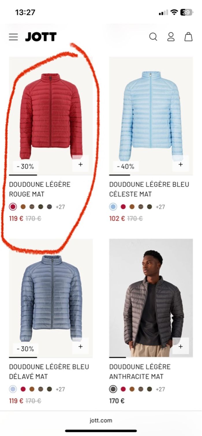 Manteau Jott rouge taille S homme, modèle Mat. TOUT NEUF ! Acheté il y a quelques jours 119€ au lieu de 170€ pour mon fils… qui n’en veut pas !!! 😤 Encore dans son emballage + sac de transport Jott Cède à 80€