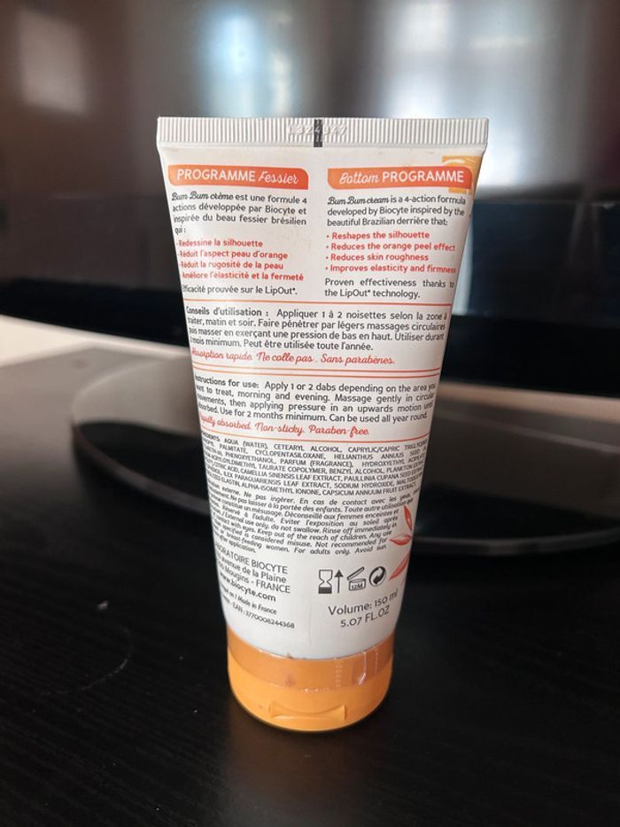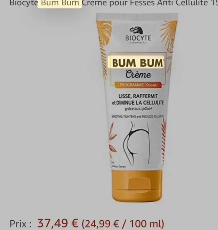 Neuf très bonne odeur ! Aujourd’hui elle est vendu sous une autre forme mais celle ci est plus efficace que la nouvelle. J’en ai acheté plusieurs mais au final, je ne prend pas le temps de les utiliser. BIOCYTE Crème Anti-Cellulite pour les fesses Lisse, Raffermit et Diminue la Cellulite* * Grâce au LipOut Programme Fessier 150ml Enrichie en guarana, thé vert et maté, Bum Bum creme pour les fesses est un soin anti cellulite. Associés à l'élastine, le fessier retrouve de la fermeté et un aspect visiblement plus lisse. Elle contient également du LipOut, un actif à base d'algue. Minces et pulpeuses à la fois, les Brésiliennes sont connues pour leur silhouette de rêve et leur fessier (bum bum) ferme et rebondi. Avec un soleil présent toute l'année qui rime avec bikini, le culte du corps est inscrit dans leur mode de vie. Pour avoir leur joli bum bum les Brésiliennes ont leurs astuces... Biocyte s'est inspiré de leurs secrets pour développer la gamme Bum Bum et son programme fessier rebondi. Celui-ci vous aide à lutter contre le relâchement des tissus, pour rendre vos fesses plus fermes et effacer la cellulite. #vanessa2626 #vanessa2626produit #minceur #cellulite #fesses #cuisses #ventre