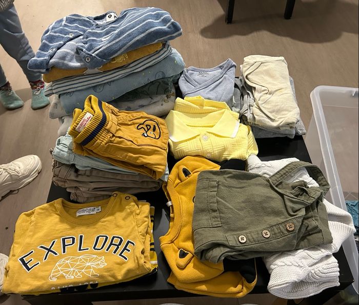Bonjour je vous propose ce lot en 9mois Le lot contient: 9 pyjama 3 body manche courte 4 body manche longue 4 pantalon 2 teeshirt manche longue 1 pull 1 gilet 1 salopette pantalon 1 ensemble 1 jogging
