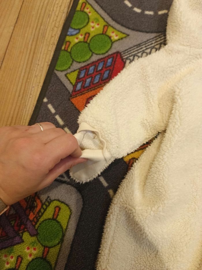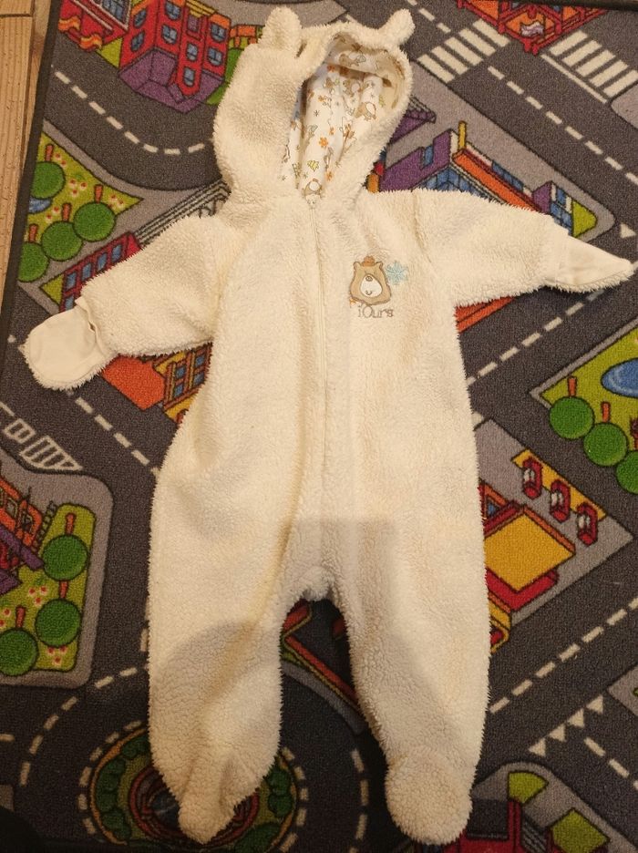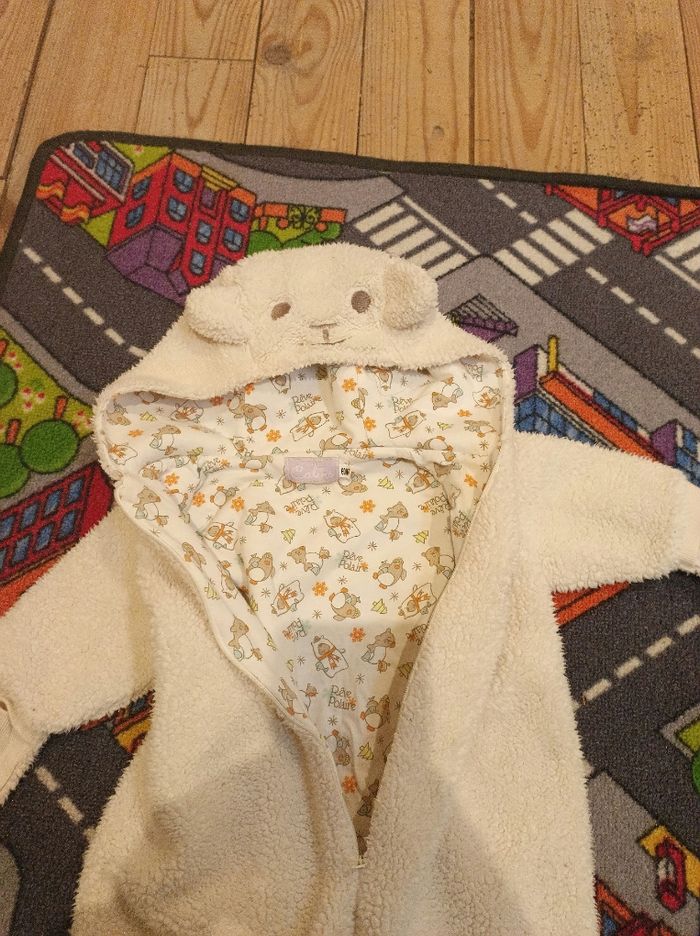 Combinaison chaude avec capuche et qui s'attache avec une fermeture possible de mettre les moufles ou non.