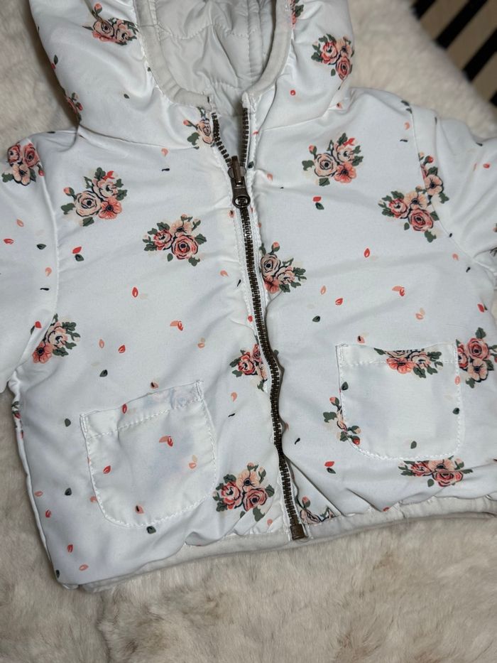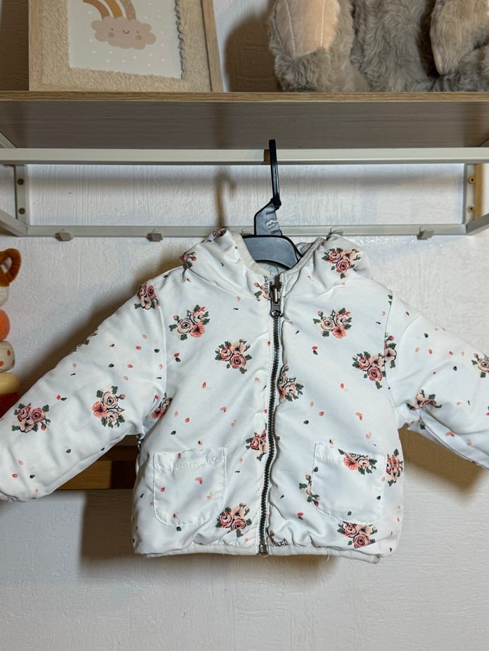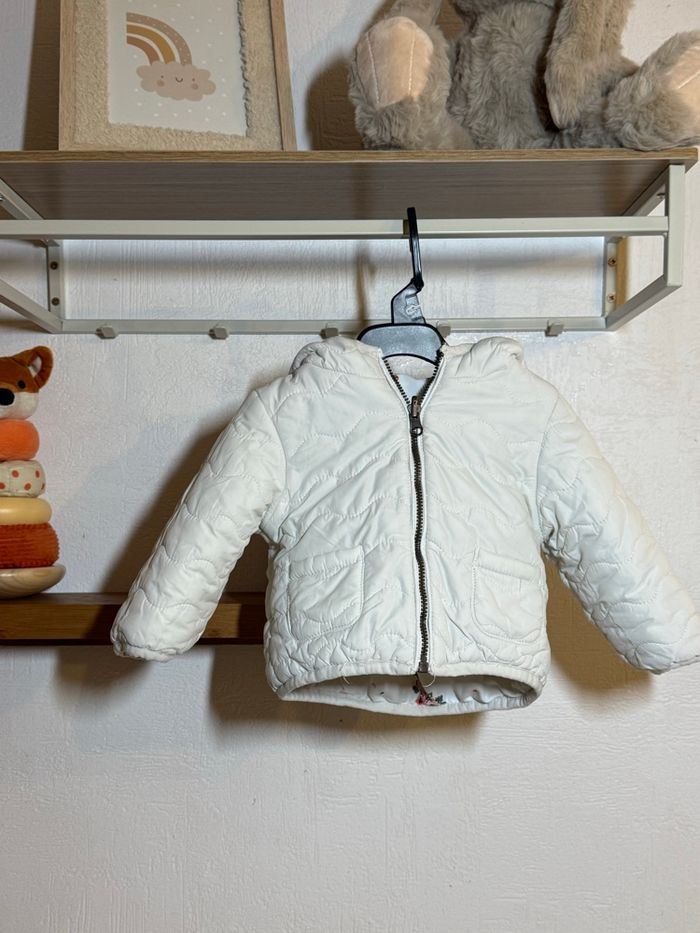 Adorable manteau bébé réversible Tape à l'Œil, parfait pour l'automne/hiver. 2 styles en 1: • Côté blanc matelassé sobre et élégant • Côté blanc fleuri tout doux avec motifs roses On change de look en un clin d'œil ! 🌸 Taille 6 mois Très bon état