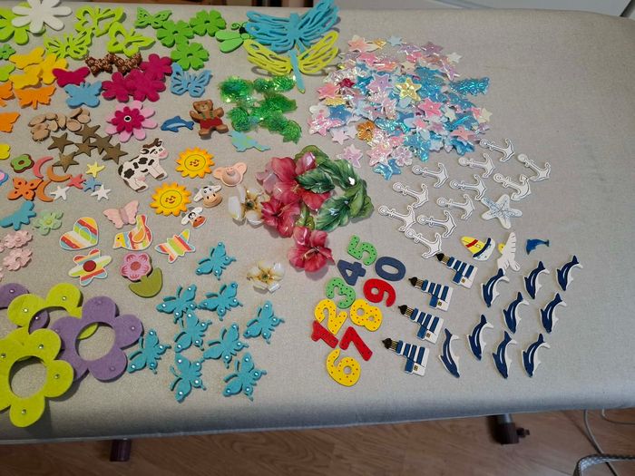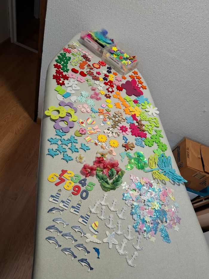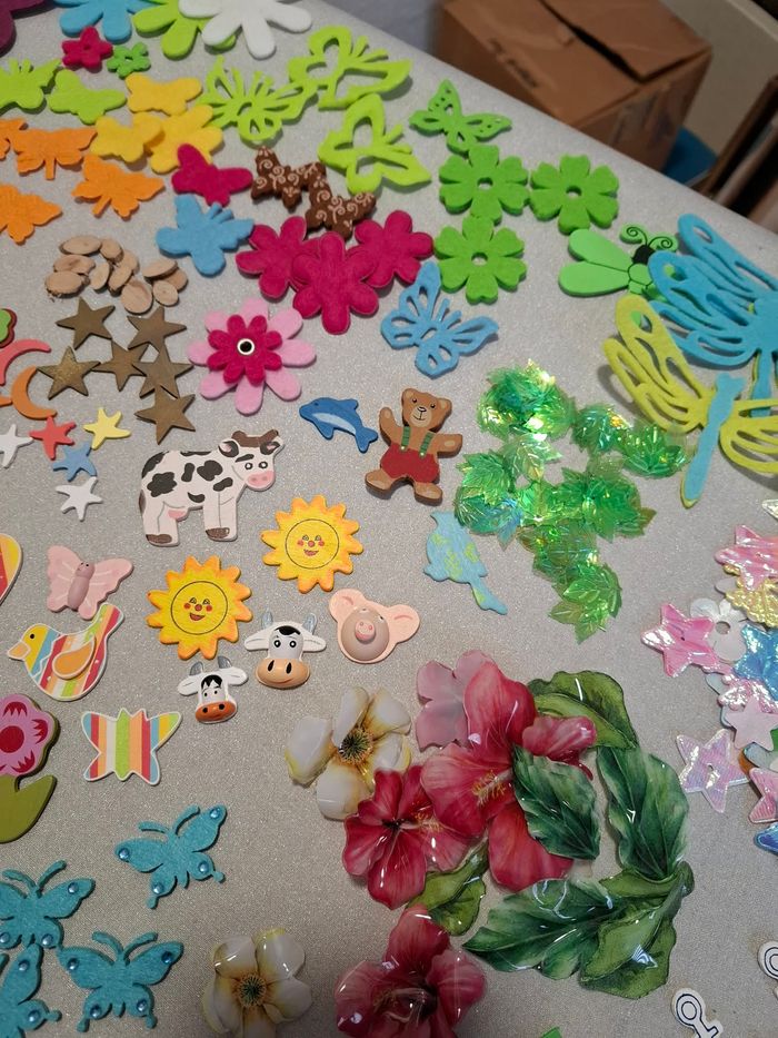 Gros lot décos scrapbooking/carterie/loisirs créatifs bois, plumes, feutrines, mousses neuf - photo numéro 1