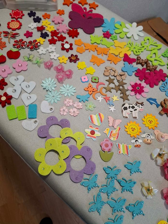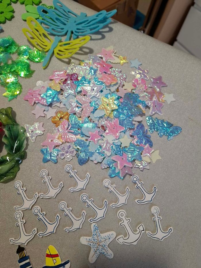 A saisir ! Gros lot de décos, divers coloris, beaucoup de neufs et d'occasion (restes de neufs) en tissu, bois, plumes, feutrine, mousse, plastique, pour décorations diverses, couture, scrapbooking, carterie, etc ... N'hésitez pas à me poser des questions ou à demander d'autres photos pour couleur, matière ou dimensions.