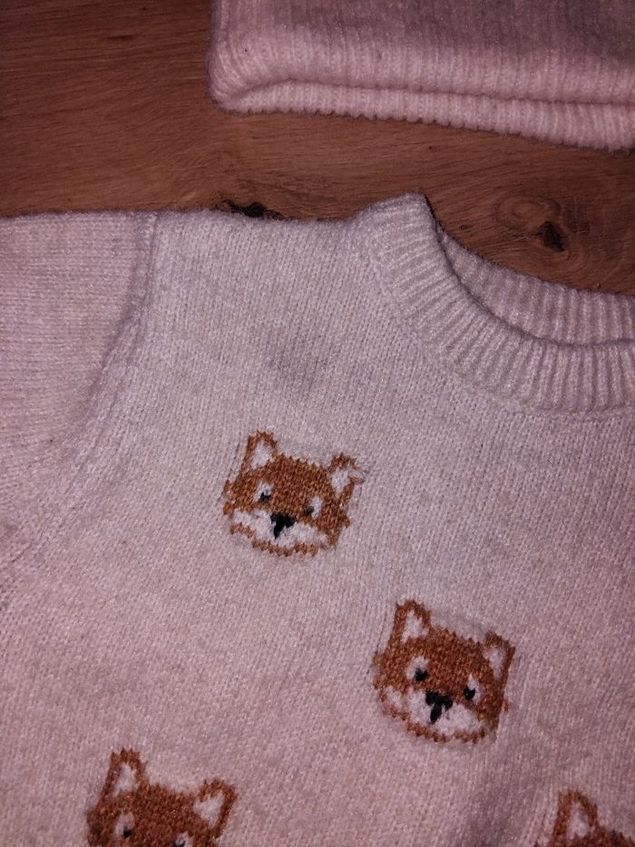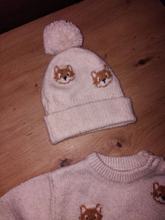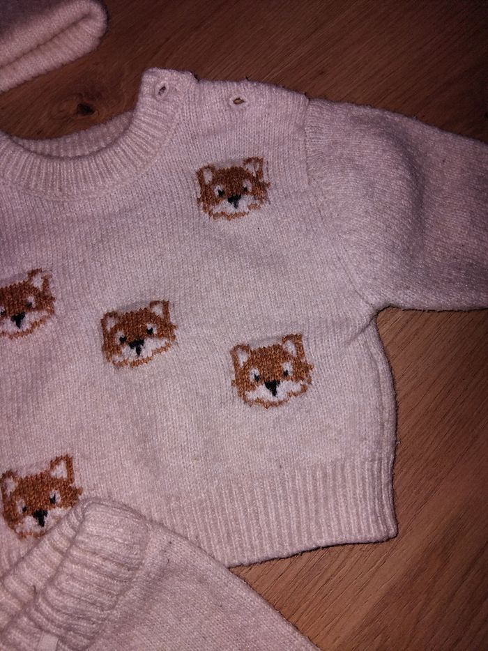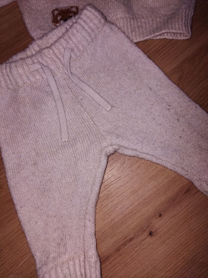 Ensemble en laine beige composée d'un bonnet, 1 pull, 1 pantalon Mini tâche sur le pull peux voyante voir photo Ensemble porté mais bonnet jamais porté Kiabi taille 3 mois