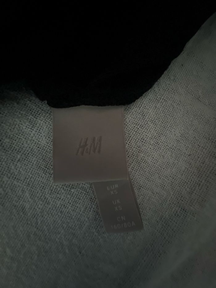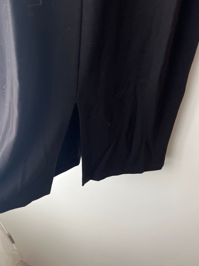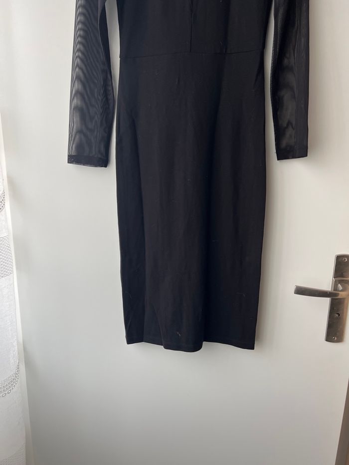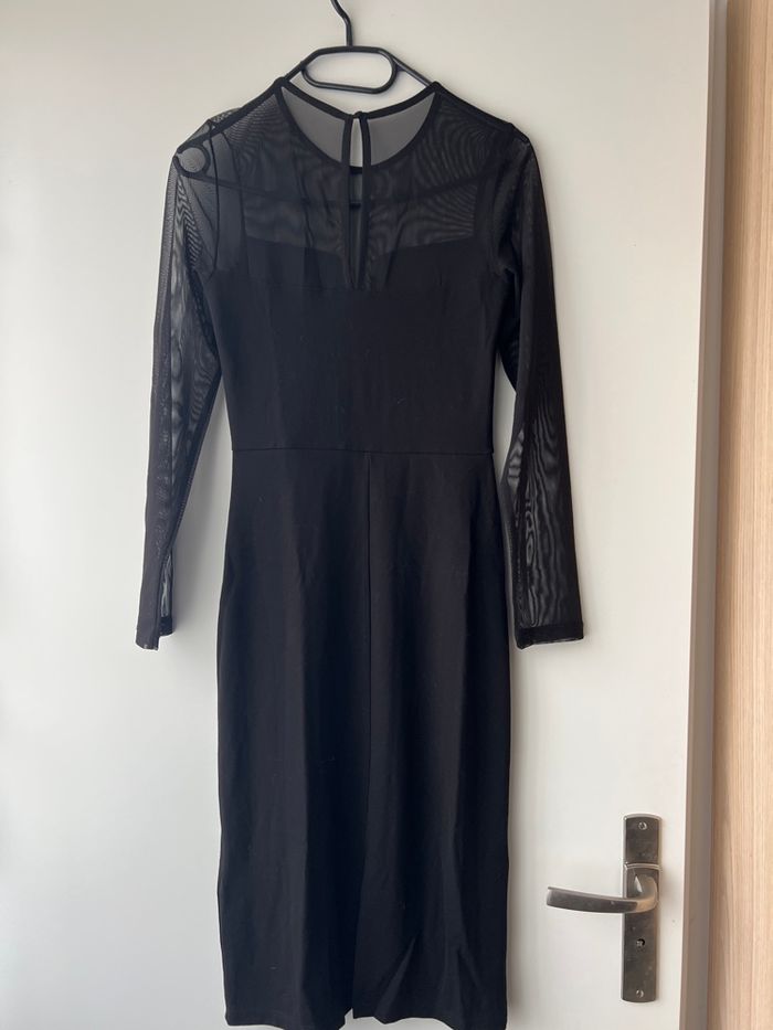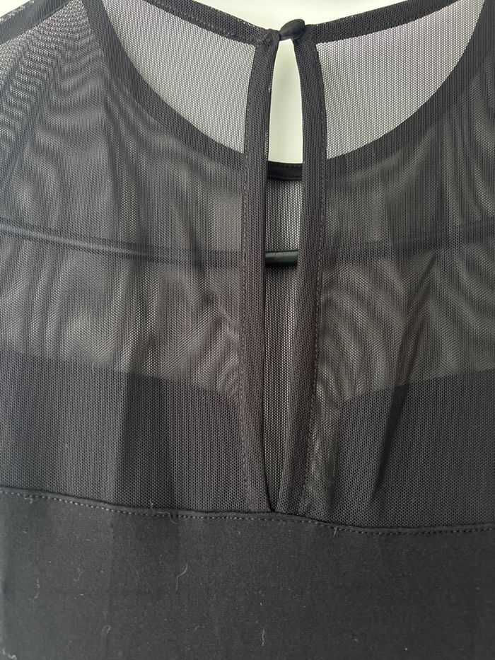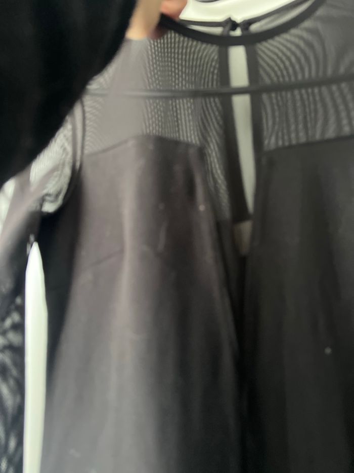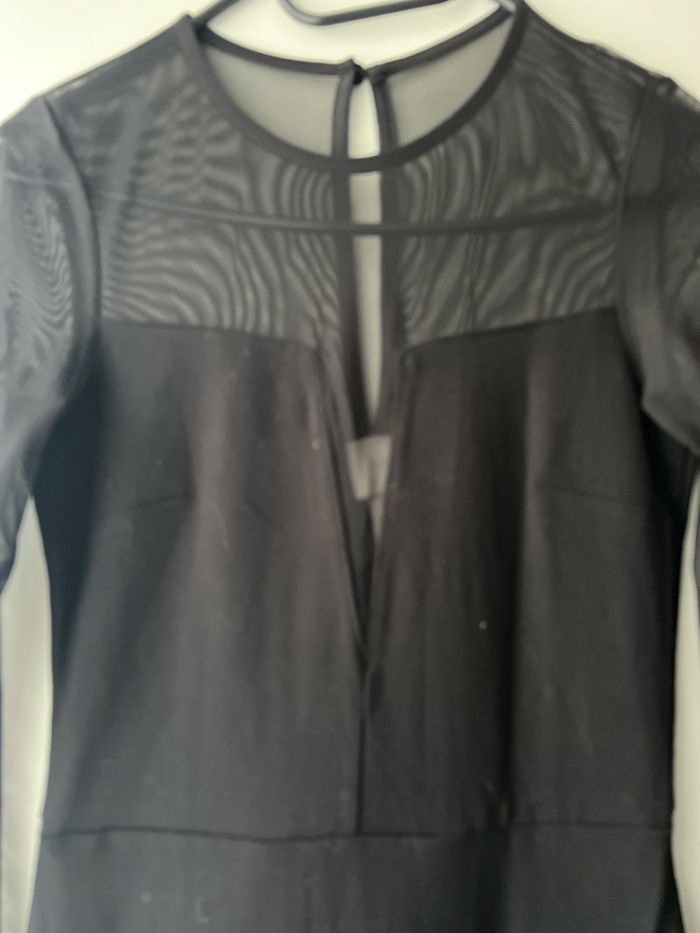 Robe noire , bi matière , droite avec voilage manches et au niveau buste et un peu le haut du dos . Neuve , taille XS mais convient à S , marque H et m