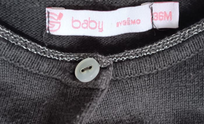 Adorable petit gilet/cardigan de couleur gris anthracite de la marque Gémo. Détail chic : Un petit nœud en tulle sur la poitrine. Finition scintillante : Liseré argenté brillant au niveau du col, des poignets et du bas du gilet. Coupe : Manches légèrement froncées aux épaules pour un effet "ballon" très mignon. Matière : 100% Coton (corps du gilet), très doux pour la peau des petits. État : bon état général. Dimensions : Largeur (aisselle à aisselle) : 27 cm Longueur (épaule jusqu'en bas) : 32 cm Taille : 36 mois / 3 ans #skms62141_fille3ans #gemo #giletbébé #cardigan36mois #modefille3ans #gris #anthracite #noeudtulle #fetes #tenuechic #babygirl