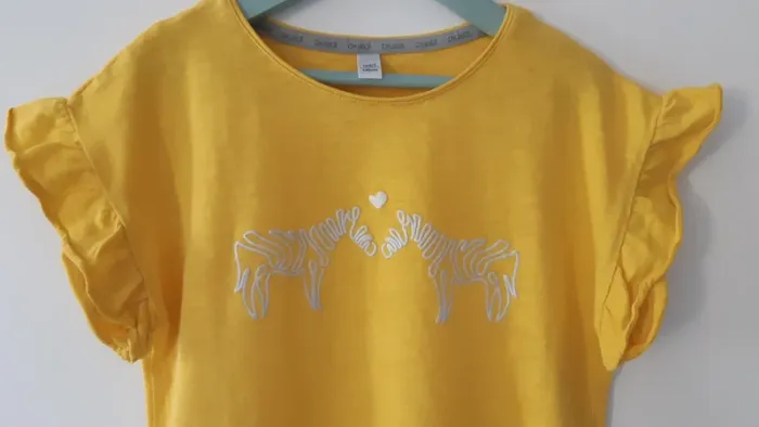 Tee shirt Okaïdi pour fille, couleur jaune. Joli motif zèbres avec petit cœur brodé sur le devant. Manches courtes avec léger volant. Matière douce et agréable à porter. ✔️ Neuf sans étiquette (juste lavé) ✔️ Taille : 10 ans (140 cm) Idéal pour le printemps / été ☀️ Envoi rapide et soigné 📦