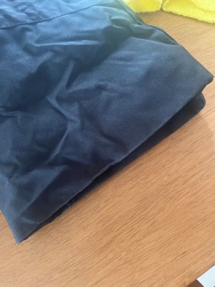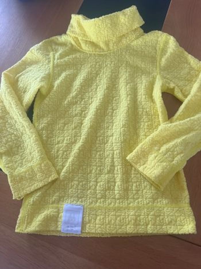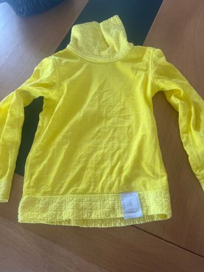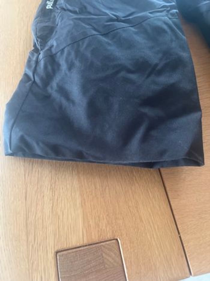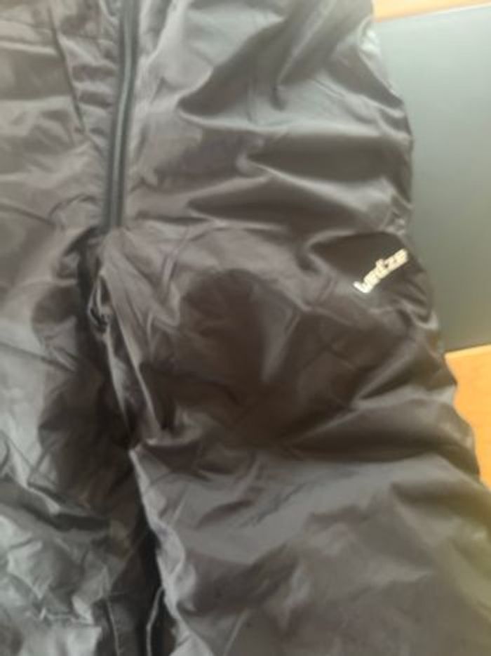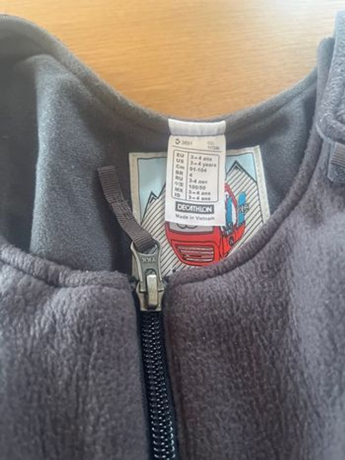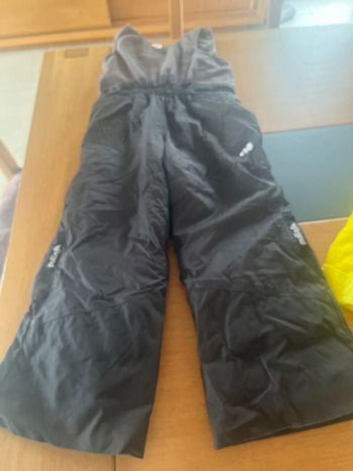 Salopette de ski avec sous pull réversible jaune. Marque décathlon en 3-4 ans. Le sous pull est thermique en très bon état La salopette est noir et grise. Petit accroc au genou voir photo. La fermeture fonctionne parfaitement