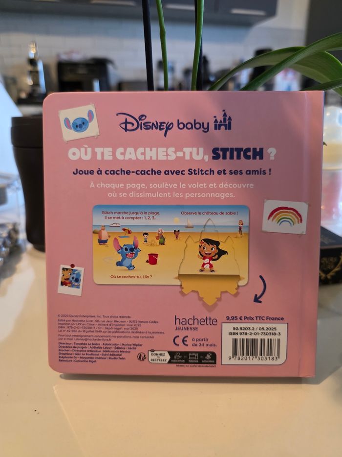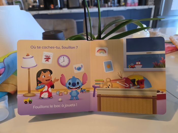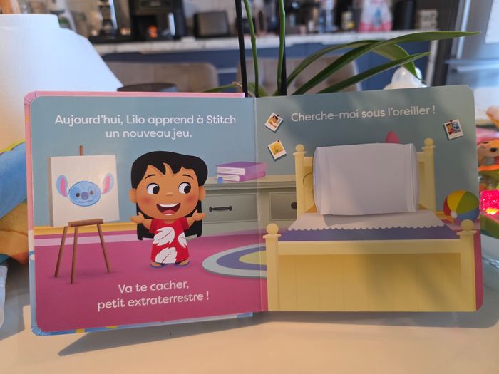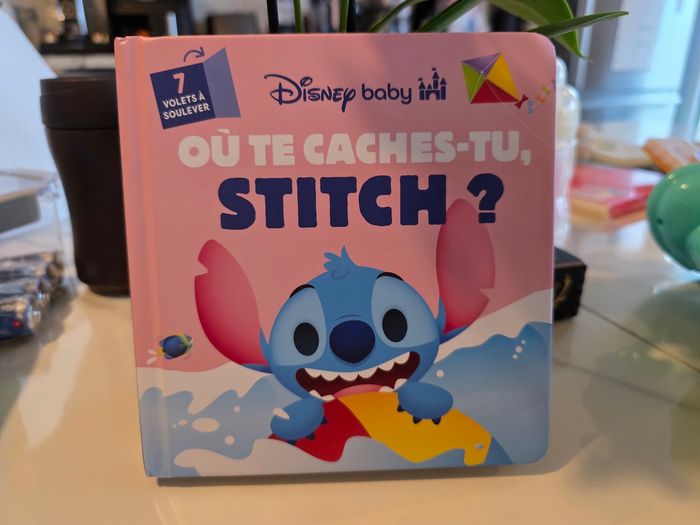Livre de Stitch de Disney Baby. Le livre contient 7 volets à soulever (voir photo). Très bien pour un enfant pour faire travailler sa motricité. Ce livre est en parfait etat, très peu utiliser. Maison non fumeurs et sans animaux.