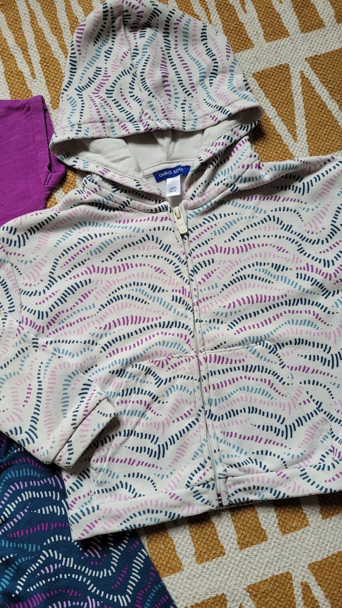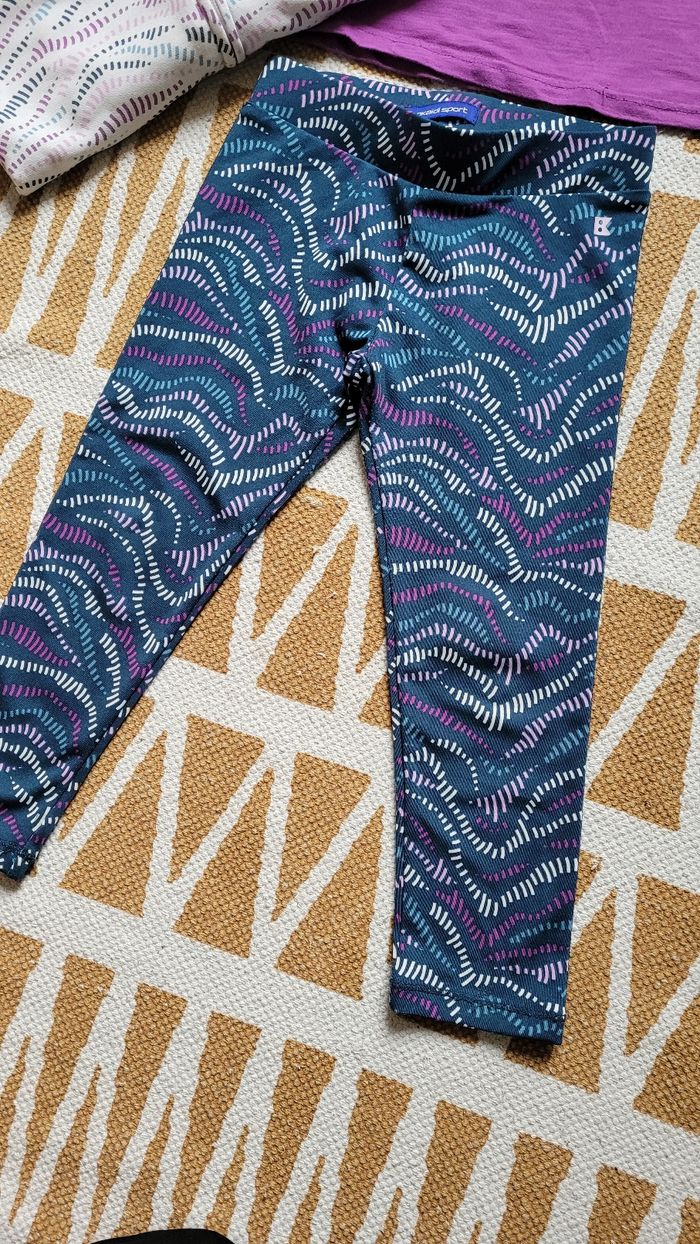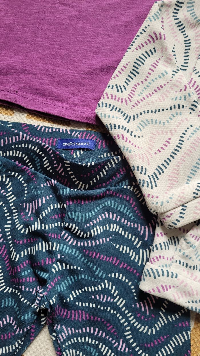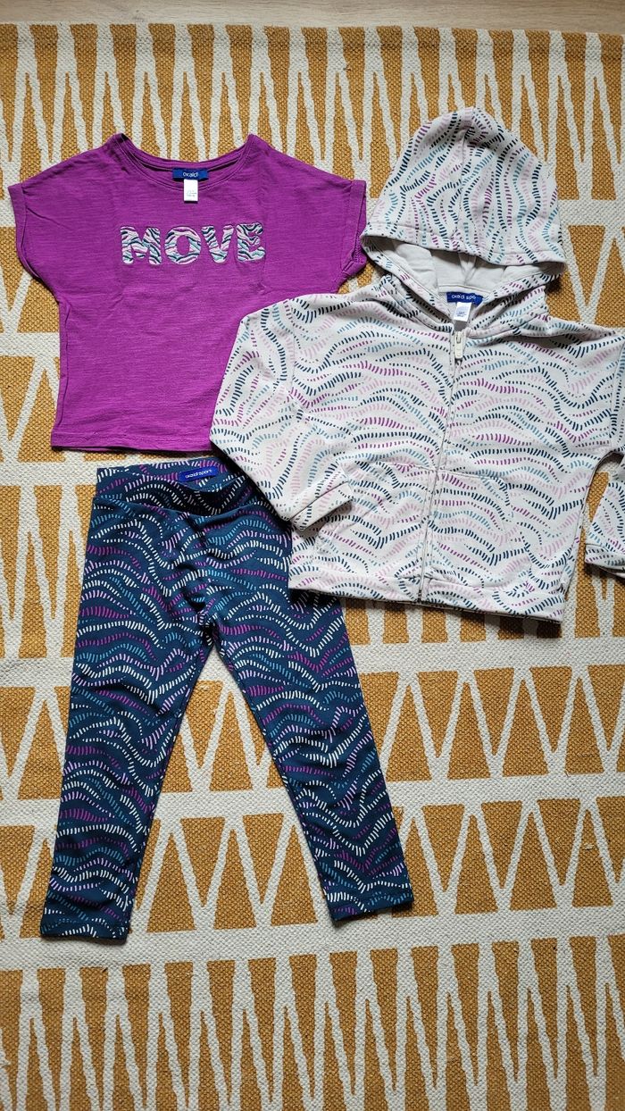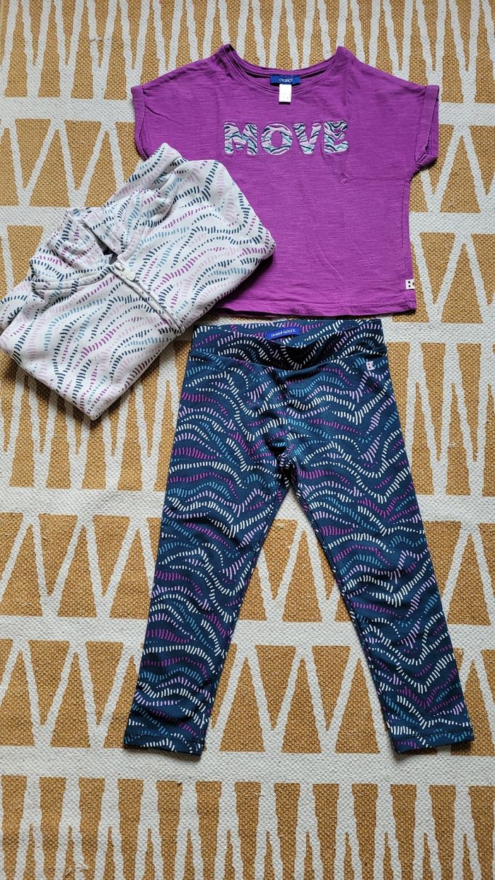 Bel ensemble 'sport' 3 pièces. Okaïdi 3ans, 1ère main de la rentrée 2024. En super état sauf la peinture de la fermeture du gilet (voir photo). Gilet zippé blanc, tee-shirt MC violet "move" et legging bleu marine avec violet (porté 1fois).