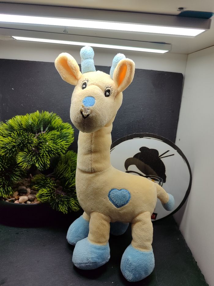 pe292 doudou girafe jaune beige bleu arthur et lola bébisol coeur peluche grelot - photo numéro 1