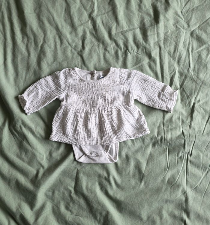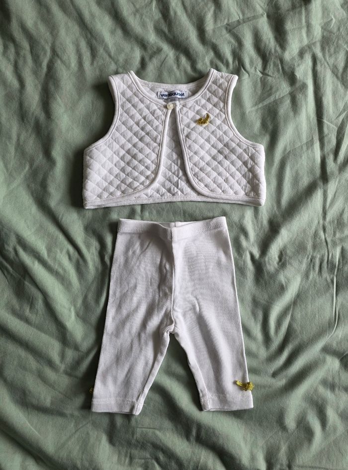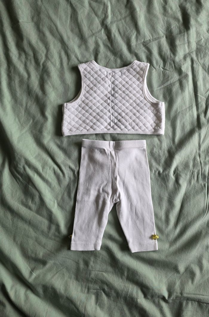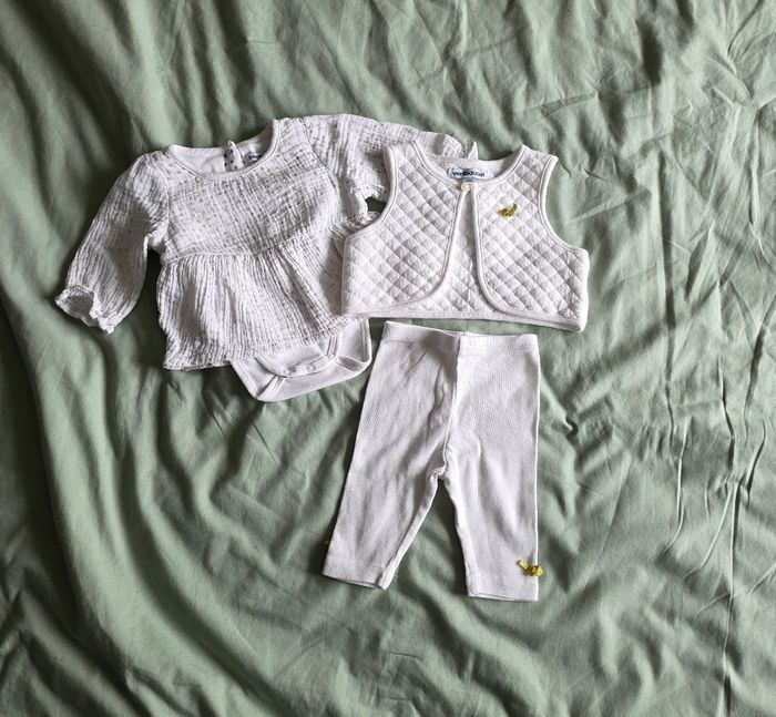 ​✨ ÉTAT : Très bon état global. Le gilet et le legging sont impeccables, le blanc est bien éclatant. Pour le body-robe, les petites étoiles dorées sont légèrement passées par endroits suite aux lavages, mais l'ensemble reste très propre et sans aucune tache. ​📏 TAILLE & COUPE : 1 mois (54 cm). Un lot complet et cohérent comprenant : ​Un legging à taille élastiquée souple. ​Un gilet boléro matelassé avec bouton nacré. ​Un body-robe "2 en 1" (le body est intégré pour que bébé reste bien au chaud). ​🌿 MATÉRIEL : 100% Coton. Matières douces et variées : gaze de coton gaufrée pour la robe, coton extensible pour le legging et tissu molletonné matelassé pour le gilet. Détails dorés (nœuds et étoiles) sur chaque pièce. ​📦 LIVRAISON : Envoi via Mondial Relay (lockers), Shop2Shop ou Chronopost (point relais physique). ​🎁 Réductions sur les lots activées ! C'est le moment idéal pour préparer le trousseau de naissance avec cet ensemble assorti.
