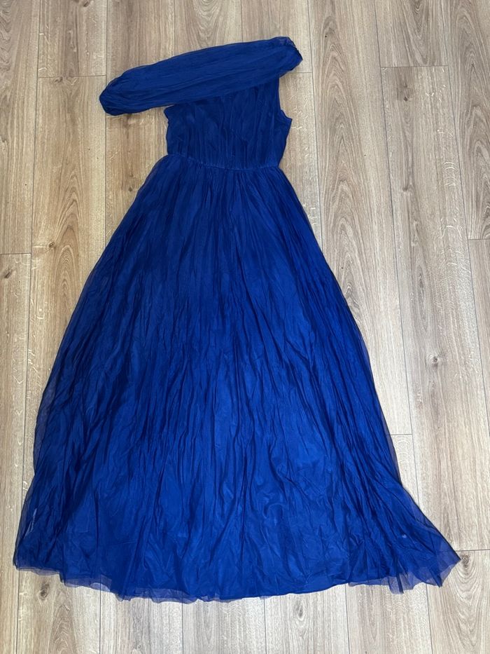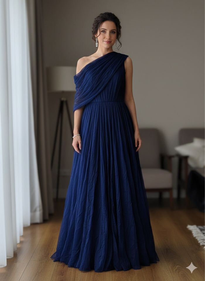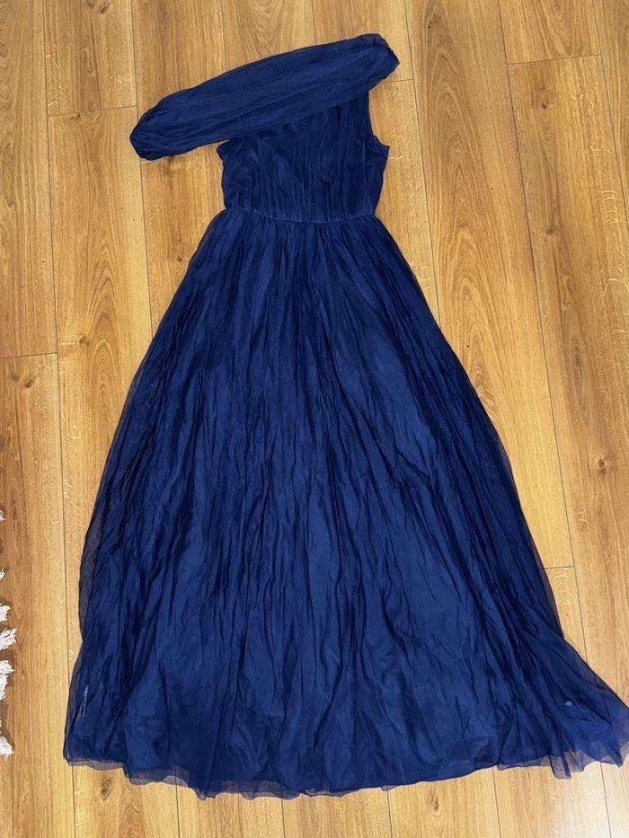 Robe longue bleu marine, très élégante et fluide. Coupe asymétrique une épaule, matière légère type tulle, tombé aérien et féminin. Cintrée à la taille, elle met joliment la silhouette en valeur. Parfaite pour : • soirée • mariage • cérémonie • événement chic ✔️ Neuf avec étiquette ✔️ Couleur bleu marine intemporelle ✔️ Confortable et élégante