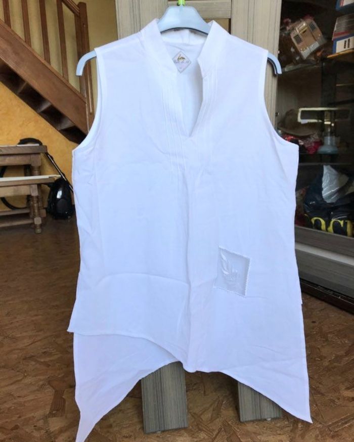 Tunique sans manches neuve, jamais portée avec un petit carré brodé ajouré en bas. Col en V. Marque blanc du Nil. Taille 4 (42)