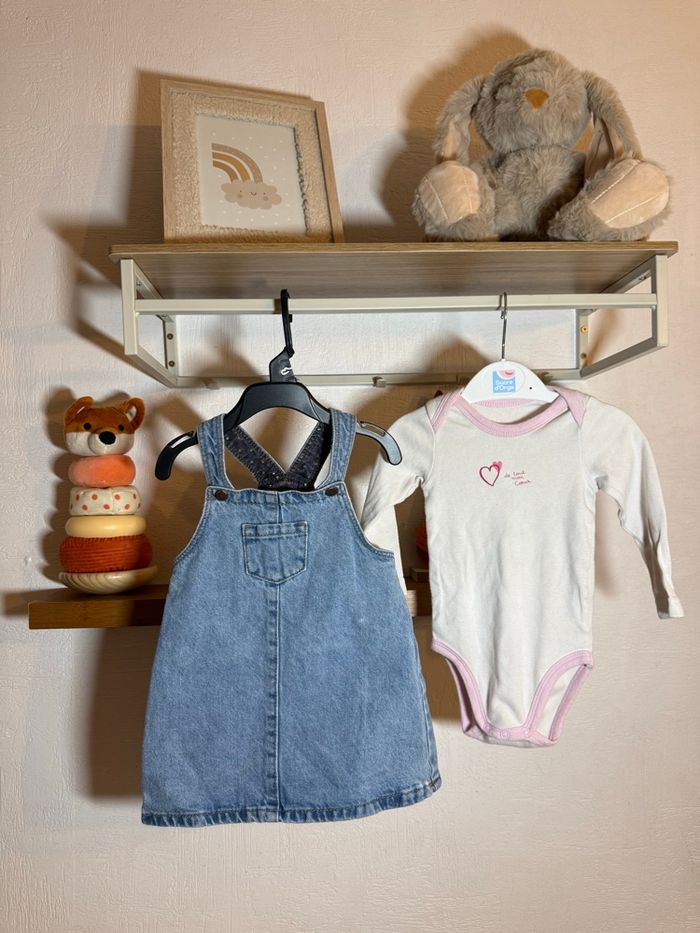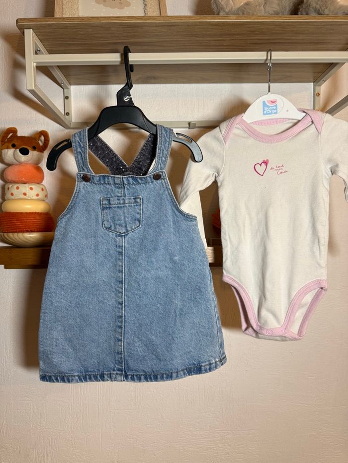 Jolie ensemble bébé composé de : 🩵 robe salopette en jean Kiabi 🤍 bodie blanc manches longues avec liserés roses et petit motif cœur Taille 6 mois - 67cm Très bon état