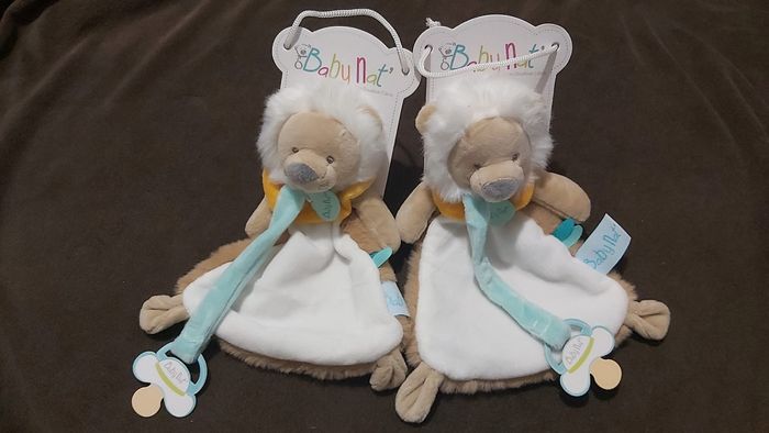 Très joli doudou pour bébé ainsi qu'une lanière pour sa tototte 😊 Vendu 15 € en occasion sur beebs doudou plat lion jaune de la marque BABY'NAT 20 euros pour les Deux ! Au cas où il se perd ou si il faut l'avoir chez mami ou papi
