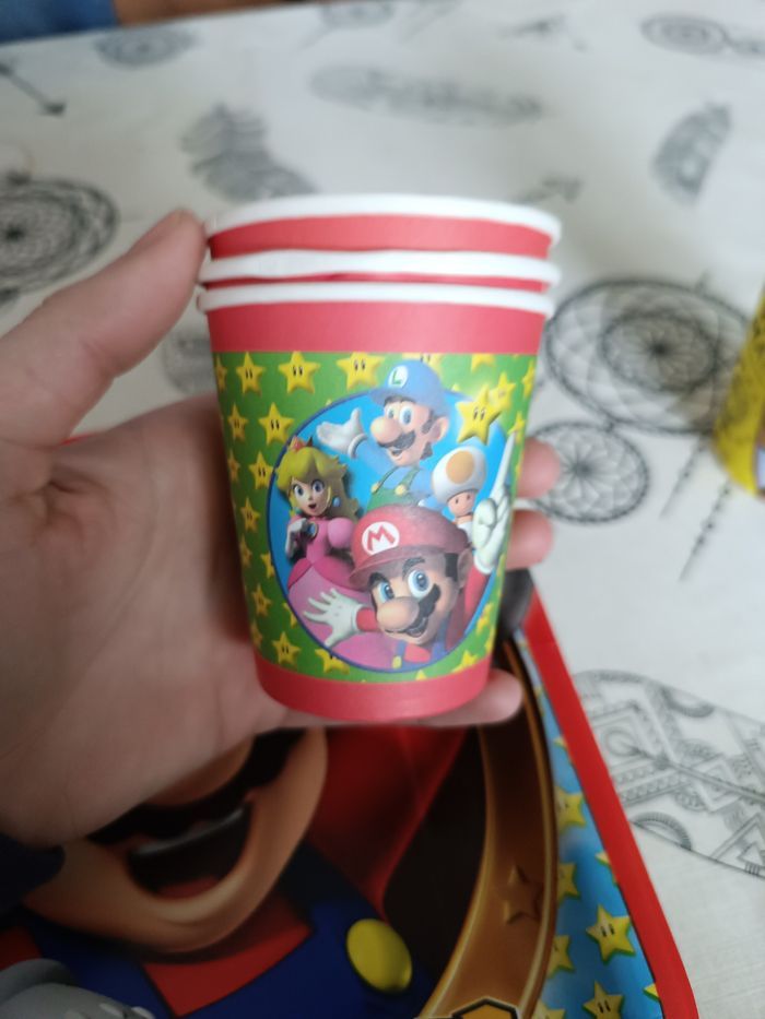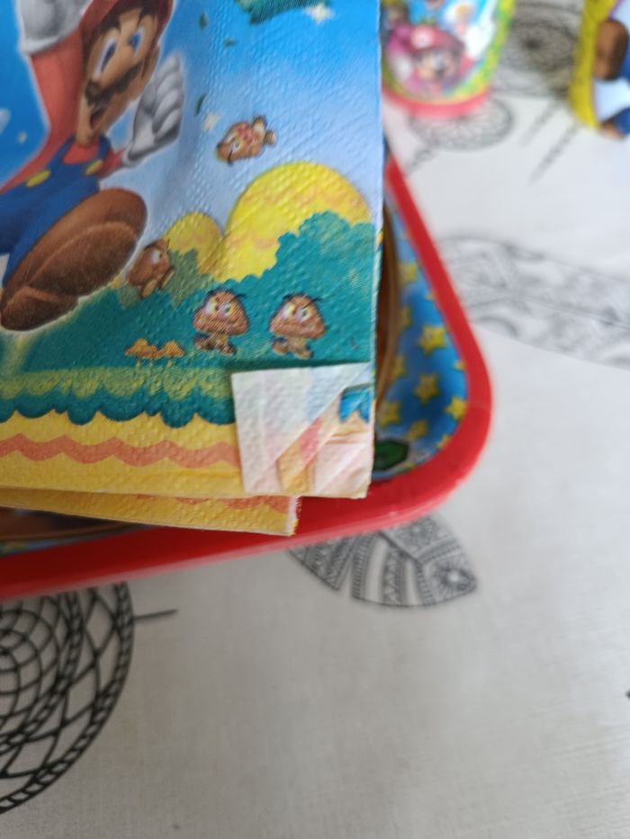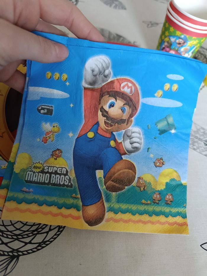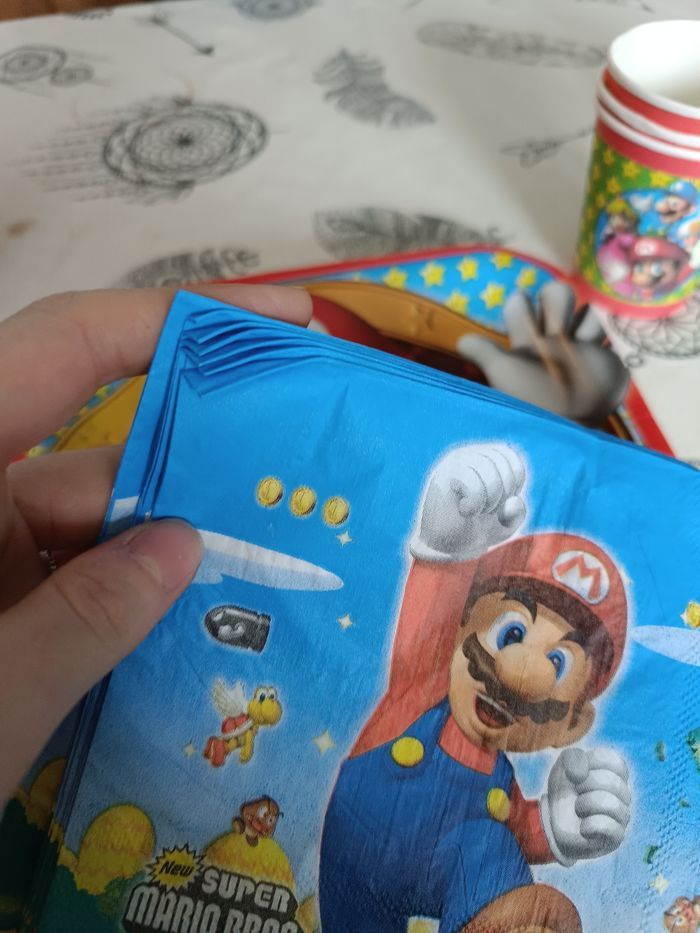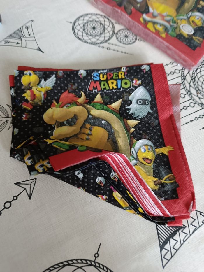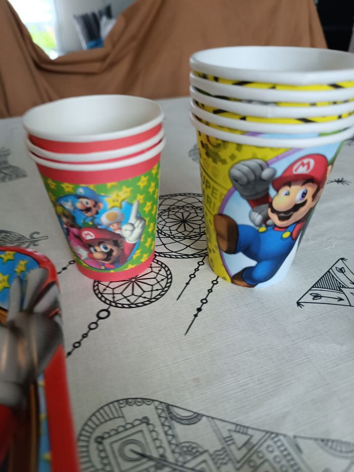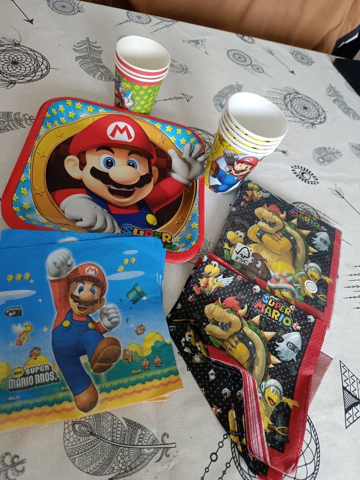 Pas mal de serviettes dont un paquet sous blister ( d autres cornées et d autres pliēs voir photo) 5 verres Mario et 3 autres plus petits ( pas le même model) 8 assiettes en carton. Le tout n a jamais été utilisé.