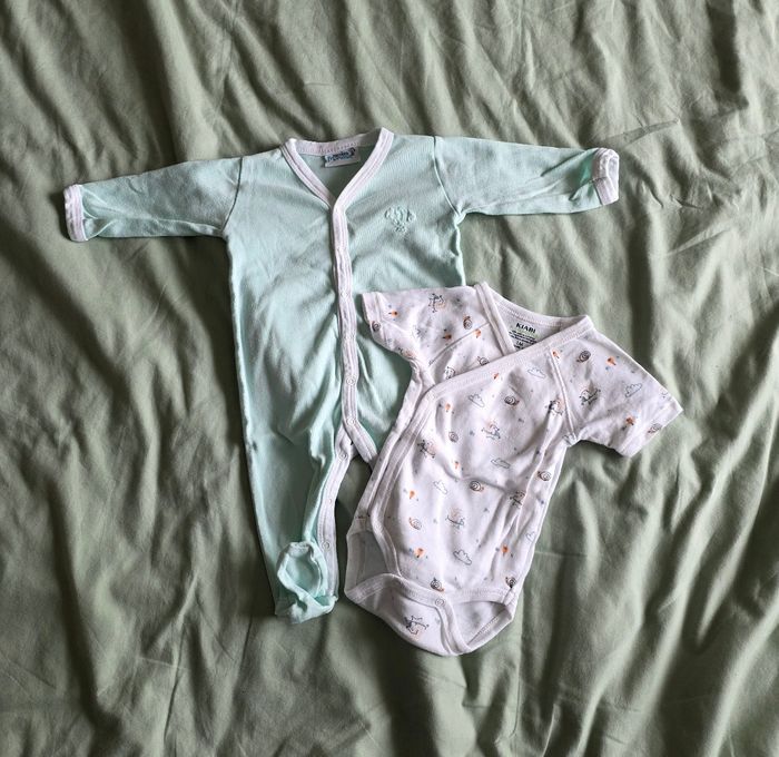 ​✨ ÉTAT : Très bon état. Le coloris vert menthe et le blanc sont bien éclatants. Aucune tache ni bouloche à déplorer, et les pressions tiennent parfaitement. ​📏 TAILLE & COUPE : 1 mois (52-55 cm). Ce lot comprend : ​1 pyjama long vert menthe (Premiers Moments), ouverture par pressions sur le devant. ​1 body manches courtes blanc à motifs (Kiabi), forme croisée cache-cœur idéale pour les premiers mois. ​🌿 MATIÈRE : 100% Coton Bio. Matière souple, douce et saine pour la peau fragile de bébé. Joli détail de montgolfière brodée sur le pyjama. ​📦 LIVRAISON : Envoi via Mondial Relay (lockers), Shop2Shop ou Chronopost (point relais physique). ​🎁 Réductions sur les lots activées ! Profitez-en pour grouper vos achats et compléter le trousseau de naissance.