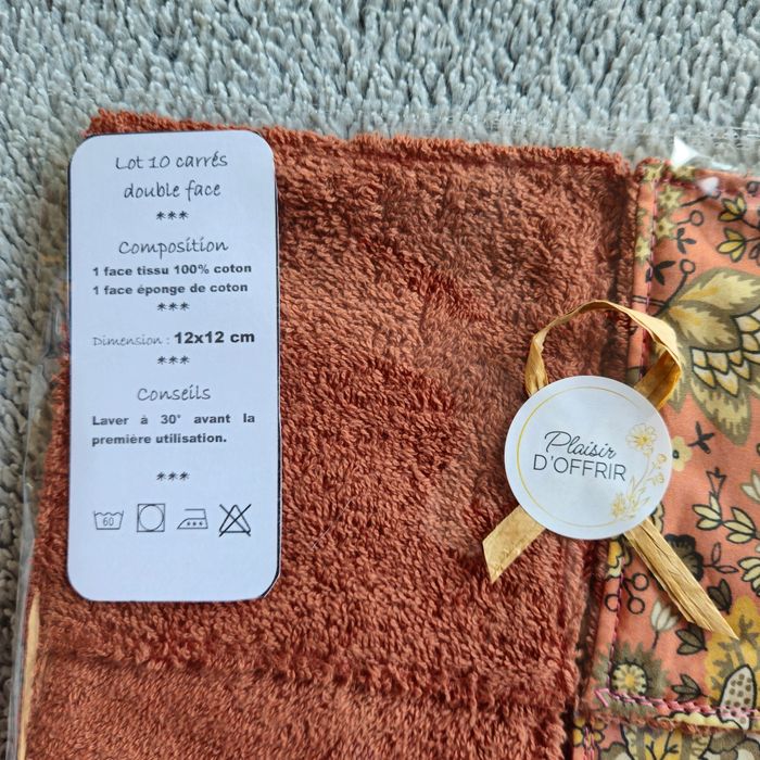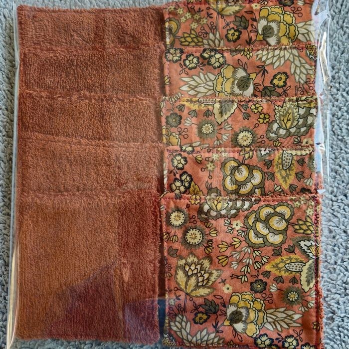 Lot 10 lingettes double face un côté tissu 100%coton motif automnal et un côté éponge de coton brique lavables jusqu'à 60 degrés Taille 12x12 cm Neufs jamais utilisés Achetez en lots réduction automatique à partir de 3 articles