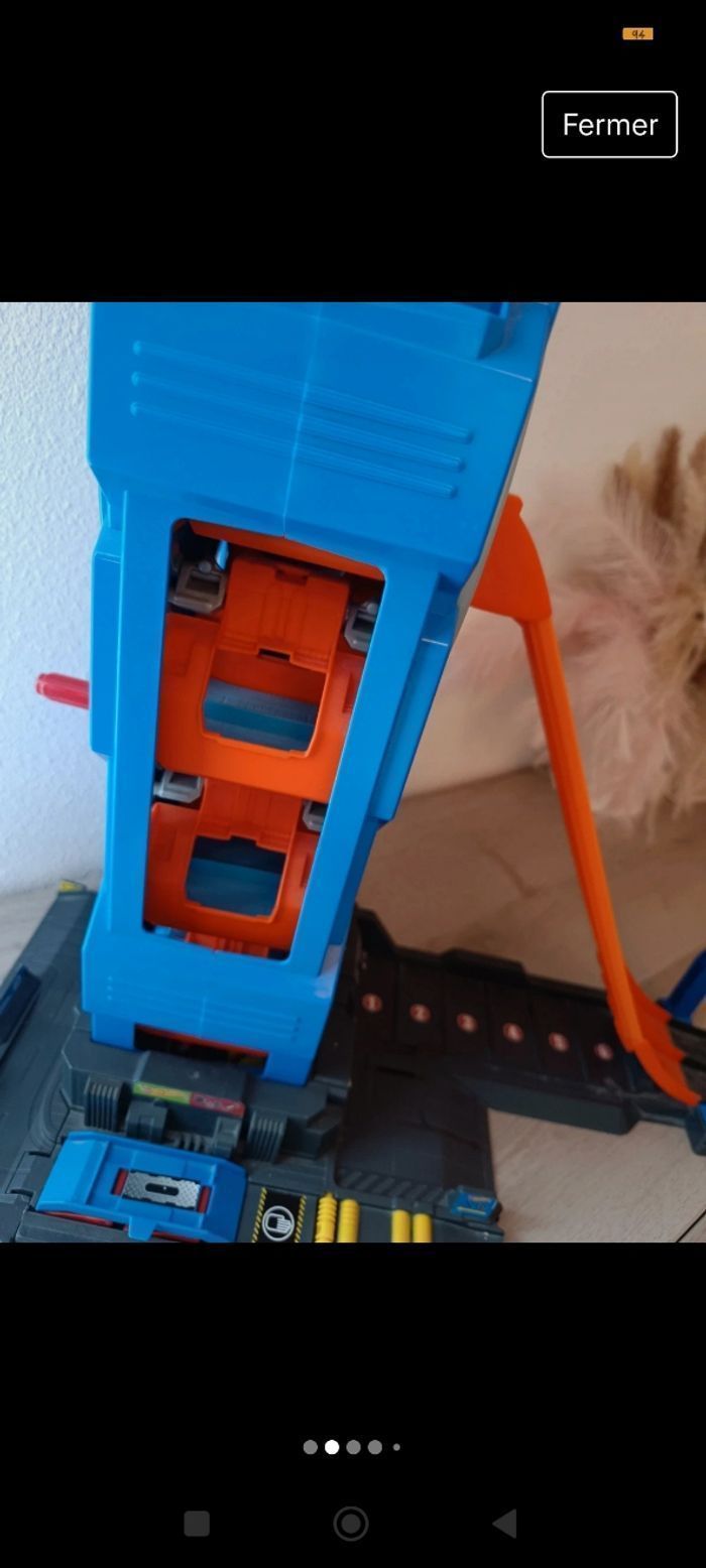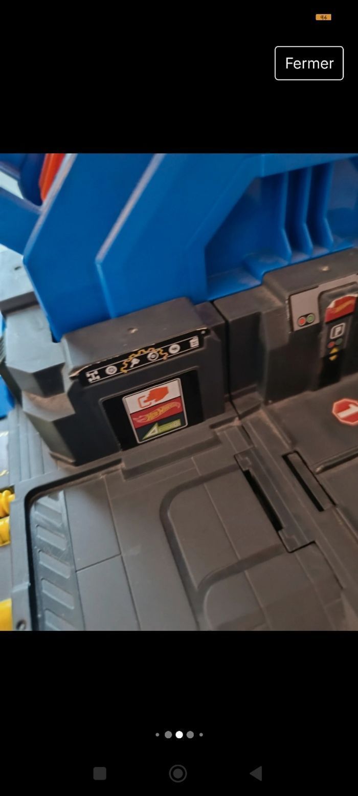 Bon état, quelques autocollants un peu défraîc unhis. Pose d'extension possible. La manivelle fonctionne et permet aux voitures de tourner dans le circuit et de descendre par la suite.