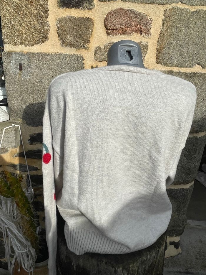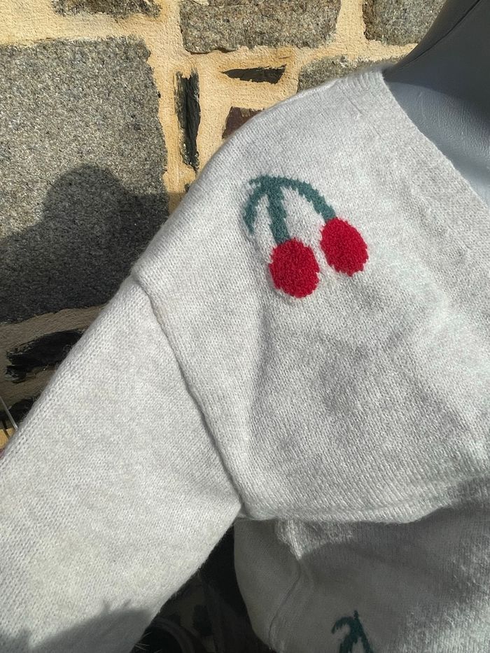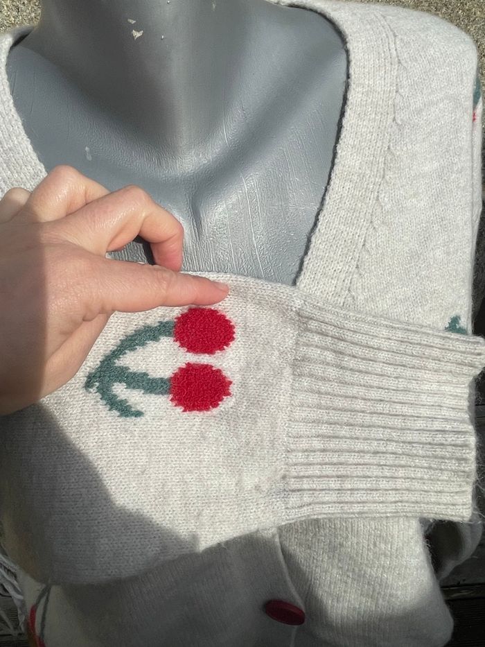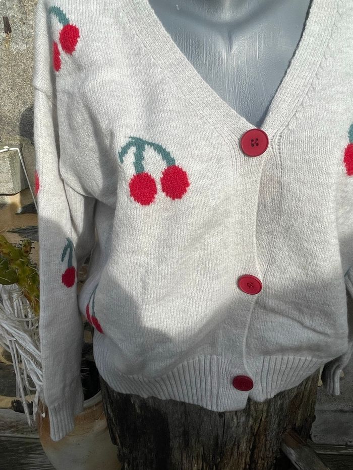 Cardigan en maille gris clair avec des cerise brodée Taille XL Très bonne état Boutique indépendante